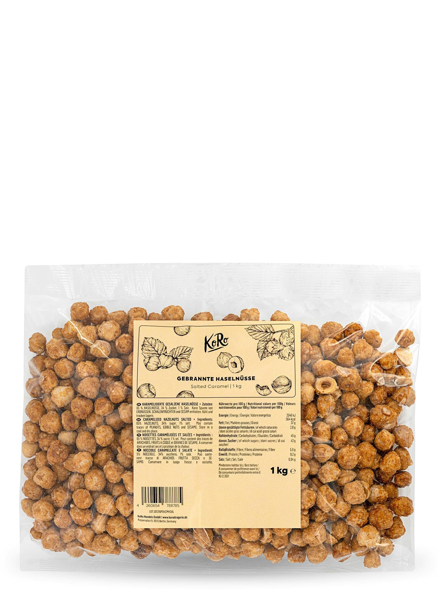 PRINCIPLES: At KoRo, we have made it our mission to guarantee you the best quality at fair prices in practical large packages. That's why your favorite products are available from us in attractive packaging!. FOR YOU: Thanks to our practical 1 kg packaging, you will no longer have to stand in front of an empty bag of hazelnuts at the Christmas market. You can enjoy the glazed hazelnuts comfortably on your sofa - even without a Christmas market and without caramelizing them yourself in your kitchen! Whether in spring, summer, autumn, or winter!. FINE FOODIES: A small pinch of salt enhances the taste of every dish, including candied walnuts in sugar. The delicious salted caramel walnuts combine the best of the aroma of harsh hazelnuts with a crunchy glaze of aromatic and sweet caramel. A simply delicious combination!. VERSATILE: Thanks to our salted caramel hazelnuts, you'll never have to choose between salted and sweet hazelnuts again. Our glazed hazelnuts aren't just delicious as Christmas treats. They're also ideal for filling delicious nut and nougat tarts, creamy desserts, or for making nut and caramel cookies. NATURAL: For our hazelnuts, we use only whole, untreated hazelnuts and glaze them with granulated sugar and a pinch of salt. The result is a crunchy hazelnut, coated in a shiny, dark caramel shell.PRINCIPES : Chez KoRo, nous nous sommes donné pour mission de vous garantir un approvisionnement de la meilleure qualité à des prix équitables dans des grands emballages pratiques. C'est pourquoi vos produits préférés sont disponibles chez nous dans des emballages avantageux !. POUR VOUS : Grâce à notre emballage pratique de 1 kg, vous n'aurez plus à vous retrouver devant un sac de noisettes vide au marché de Noël. Vous pouvez savourer les noisettes glacées confortablement installé dans votre canapé - même sans marché de Noël et sans caraméliser vous-même dans votre cuisine ! Que ce soit au printemps, en été, en automne ou en hiver !. FINS GOURMETS : Une petite pincée de sel rehausse le goût de chaque plat, y compris les noix confites dans le sucre. Les délicieuses noix au caramel salé associent le meilleur de l'arôme de noisettes âpres à un glaçage croquant de caramel aromatique et sucré. Une combinaison tout simplement délicieuse !. POLYVALENT : Grâce à nos noisettes au caramel salé, vous n'aurez plus jamais à choisir entre les noisettes salées et les noisettes sucrées. Nos noisettes glacées ne sont pas seulement délicieuses comme friandises à Noël. Elles sont également idéales pour garnir de délicieuses tartes aux noix et au nougat, des desserts crémeux ou pour confectionner des biscuits aux noix et au caramel. NATUREL : Pour nos noisettes, nous utilisons exclusivement des noisettes entières non traitées et nous les glaçons avec du sucre cristallisé et une pincée de sel. Il en résulte une noisette croquante, enrobée d'une coque brillante de caramel foncé.