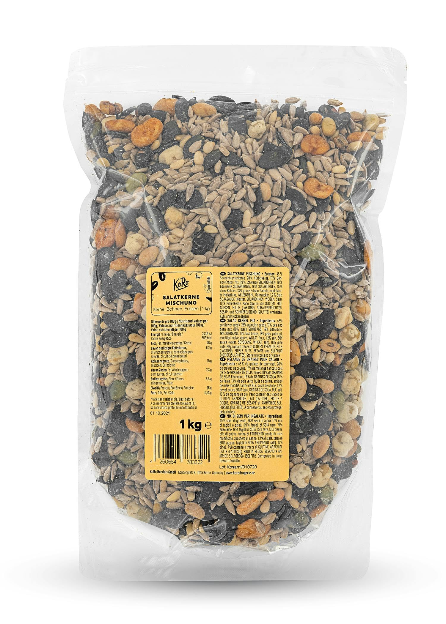 PRINCIPLES: At KoRo, we've made it our mission to provide you with the best quality at fair prices in convenient bulk packs. That's why we offer your favorite products in large sizes!. FOR YOU: Our balanced seed mix not only refines salads. The seed mix also tastes delicious with baked vegetables and casseroles, as well as with pasta. Sprinkle the seeds over all your favorite dishes to give them an extra portion of crunch!. PRICELESS: With our seed mix, add valuable unsaturated fatty acids to all your creations. Does lettuce shrink your biceps? No chance - thanks to our salad seed mix, which is also a real source of protein. VERSATILITY: From edamame to black soybeans to fine pine nuts, you'll find everything your heart desires in our salad seed mix. DELICIOUS: The blend of organic sunflower seeds and natural pumpkin seeds with roasted beans and peas makes a simple salad an explosion of flavors.PRINCIPES : Chez KoRo, nous nous sommes donné pour mission de vous fournir la meilleure qualité à des prix équitables dans des emballages pratiques en vrac. C'est pourquoi nous vous proposons vos produits préférés en grand format !. POUR VOUS : Notre mélange équilibré de graines n'affine pas seulement les salades. Le mélange de graines est également délicieux avec les légumes au four et les plats mijotés, ainsi qu'avec les pâtes. Saupoudrez les graines sur tous vos plats préférés pour leur donner une portion supplémentaire de croquant !. INESTIMABLE : Avec notre mélange de graines, ajoutez de précieux acides gras insaturés à toutes vos créations. La laitue fait-elle rétrécir vos biceps Aucune chance - grâce à nos mélange de graines pour salade, qui sont aussi une véritable source de protéines. POLYVALENCE : Des edamames aux graines de soja noires en passant par les pignons fins, vous trouverez tout ce que votre cœur désire dans notre mélange de graines pour salade. DELICIEUX : Le mélange de graines de tournesol bio et de graines de courges naturelles avec des haricots et des pois grillés fait de la simple salade une explosion de saveurs.