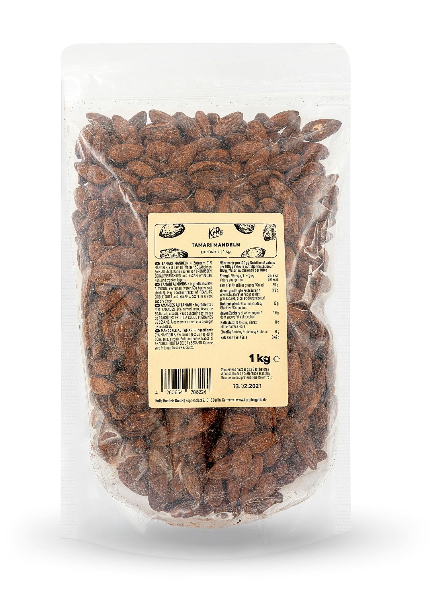 PRINCIPLES: More is easy! Therefore, all the snacks at KoRo are in the packaging – fill the packaging and enjoy the cash register!. PRINCIPLES: At KoRo, we have made it our mission to provide you with the best quality at fair prices in convenient large sizes. That's why we offer your favorite products in value packs!. FOR YOU: We're starting to know the snack aisles by heart! It's the same for you. So try our tamari almonds now, because they bring a breath of fresh air to the shelves!. FOR ANY OCCASIONS: Whether at a picnic in the park, as a snack between meals, or as a snack with friends, our tamari almonds are an exceptional snack for any occasion. You'll be convinced! QUALITIES: Are you tired of protein shakes and bars? Then try our tamari almonds now. Their protein content helps you build muscle, making them an ideal snack for athletes! NATURAL: We attach great importance to nature and our land. That's why we pay particular attention to the origin of our products and their production method.PRINZIPIEN: Mehr ist einfach mehr! Daher gibt es alle Leckereien bei KoRo in Vorteilspackungen – Füllt den Vorratsschrank und erfreut den Geldbeutel!. PRINCIPES : Chez KoRo, nous nous sommes donné pour mission de vous fournir la meilleure qualité à des prix équitables en grands formats pratiques. C'est pourquoi nous proposons vos produits préférés en packs économiques !. POUR VOUS : On commence à connaître les rayons de snacks par cœur ! C'est pareil pour vous Alors essayez dès maintenant nos amandes-tamari, car elles apportent une bouffée de fraîcheur dans les rayons !. EN TOUTES OCCASIONS : que ce soit lors d'un pique-nique au parc, comme snack entre les repas ou comme grignotage entre amis, nos amandes au tamari constituent un encas exceptionnel en toutes occasions. Vous en serez convaincus !QUALITÉS : Vous en avez assez des shakes et des barres protéinées Alors, essayez dès maintenant nos amandes au tamari. Leur teneur en protéines vous aide à développer vos muscles et est donc un snack idéale pour les sportifs !. NATUREL : Nous accordons beaucoup d'importance à la nature et à notre terre. C'est pourquoi nous faisons particulièrement attention à la provenance de nos produits et à leur mode de production.
