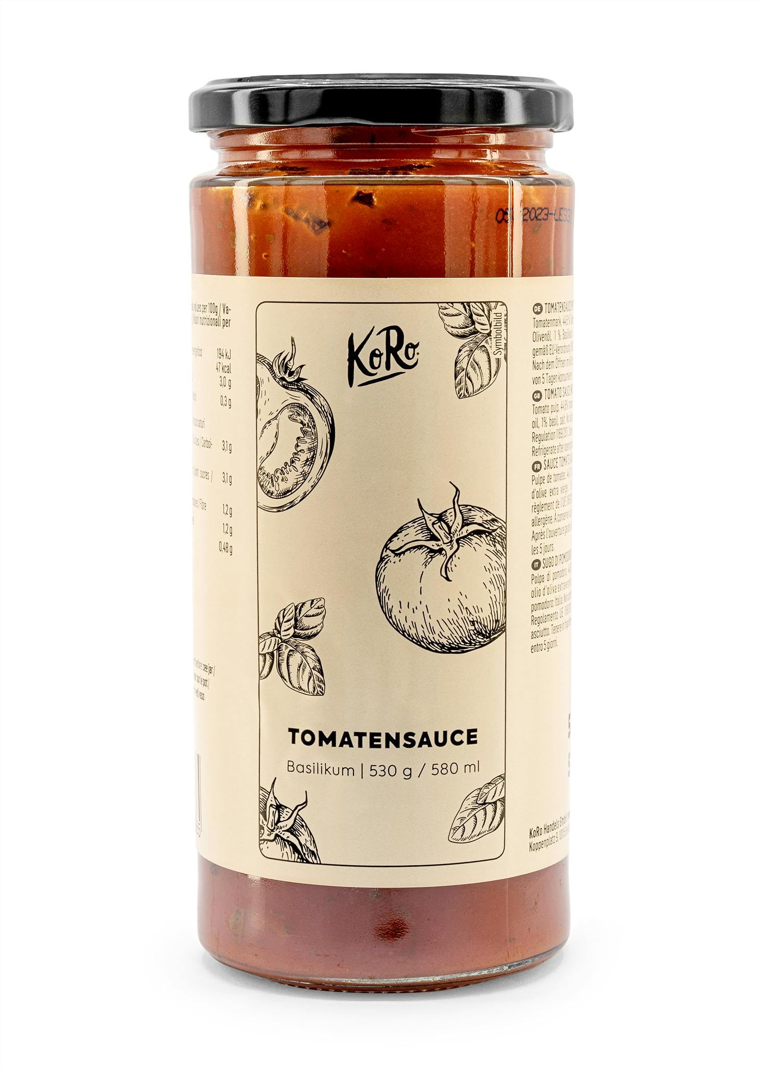 PRINCIPLES: At KoRo, we've made it our mission to provide you with the best quality at fair prices in convenient large sizes. That's why we offer your favorites in value packs! FOR YOU: Sometimes you just don't have time to make the perfect tomato sauce yourself. All you have to do for your spaghetti with tomato sauce is heat the sauce and cook your pasta al dente. If you like it even spicier, you can of course add some fresh herbs. QUALITY: Our tomato sauce is made with 100 ingredients from Italy. In addition, the sauce contains no added sugar, no flavor enhancers, and no preservatives - and you can taste it! Plus, our fresh tomato sauce is 100 vegan. MULTI-PURPOSE: Pasta is life! But what would pasta be without a perfect sauce? We thought, why not go back to basics? After all, what's better than classic pasta with tomato sauce? Our tomato sauce is perfect for any pasta dish, lasagna, and meatballs in tomato sauce. Our tomato sauce is also an ideal base for pizza. NATURAL: Only the finest Italian ingredients are used in our tomato sauce. The combination of aromatic tomato puree, spicy onions, tangy olive oil, and powerful basil offers a unique taste experience. From the first bite, it will remind you of your vacation.PRINCIPES : Chez KoRo, nous nous sommes donné pour mission de vous fournir la meilleure qualité à des prix équitables en grands formats pratiques. C'est pourquoi vos favoris sont disponibles chez nous en packs économiques !. POUR VOUS : Parfois, vous n'avez tout simplement pas le temps de préparer vous-même la sauce tomate parfaite. Tout ce que vous avez à faire pour vos spaghettis à la sauce tomate est de faire chauffer la sauce, et de cuire vos pâtes al dente. Si vous l'aimez encore plus épicée, vous pouvez bien sûr y ajouter quelques herbes fraîches. QUALITÉ : Notre sauce tomate est composée à 100 d'ingrédients provenant d'Italie. En outre, la sauce ne contient pas de sucre ajouté, pas d'exhausteurs de goût et pas de conservateurs - et ça se sent ! De plus, notre sauce tomate fraîche est 100 veganne. MULTI USAGES : Les pâtes, c'est la vie ! Mais que seraient les pâtes sans une sauce parfaite On s'est dit, pourquoi ne pas revenir à l'essentiel Après tout, quoi de mieux que les classiques pâtes à la sauce tomate Notre sauce tomate est parfaite pour tout plat de pâtes, lasagnes et boulettes de viande en sauce tomate. Notre sauce tomate est également une base idéale pour pizza. NATUREL : Seuls les meilleurs ingrédients italiens sont utilisés dans notre sauce tomate. La combinaison de purée de tomates aromatique, d'oignons épicés, d'huile d'olive piquante et de basilic puissant offre une expérience gustative unique. Dès la première bouchée, cela vous rappellera vos vacances.