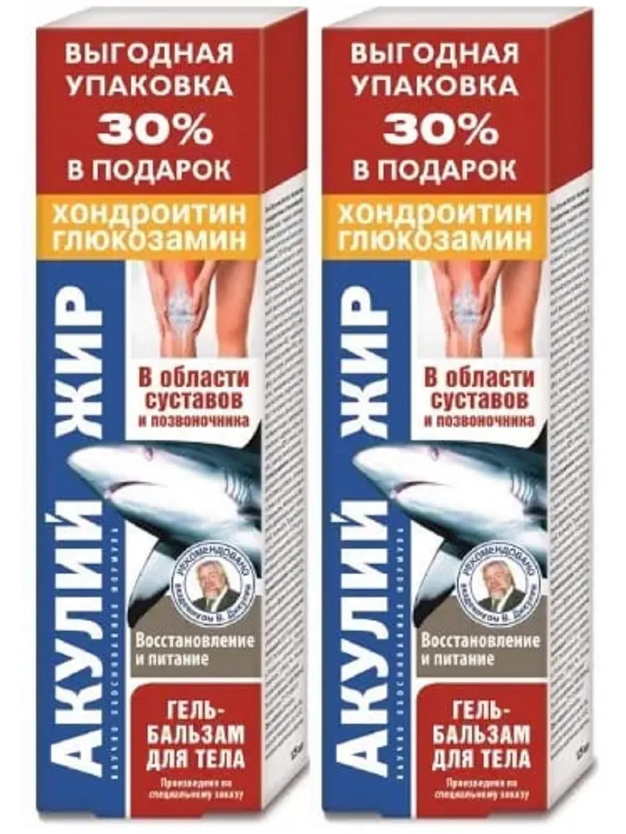 Акулий жир с хондроитином и глюкозамином гель-бальзам для тела - гель-бальзам для местного применения при заболеваниях спины и поясницы. Средства, на основе акульего жира, способствуют укреплению иммунитета, снятию признаков воспаления, выведения накопленных токсинов, поэтому могут использоваться для лечения артритов, снятия мышечных, суставных болей, после радиоактивного воздействия для предотвращения развития осложнений. Гель-бальзам способен нормализовать обменные процессы не только внутри суставов конечностей, но и внутри межпозвоночных дисков. Он также укрепляет мышцы и связки, и способен избавить от солевых отложений. Ускоряет процессы регенерации при повреждениях хрящей и костей, предотвращает разрушение хрящей, ускоряет заживление переломов, снимает болевой синдром, повышает эластичность соединительной ткани. гель-бальзам наносить на тело легкими круговыми движениями в течение 3-5 минут до полного впитывания 2-3 раза в день. Гель-бальзам предназначен для ежедневного использования. Объём тубы 125 мл.