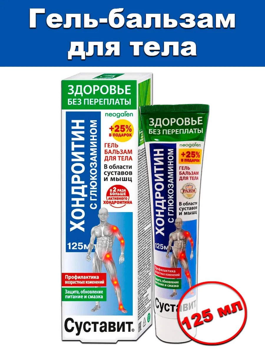 Суставит. Ходроитин с глюкозамином Neogalen(Неогален) серии Здоровье без переплаты эффективное средство на основе природных компонентов. Способствует нормализации функционального состояния опорно-двигательного аппарата. Обеспечивает структурными элементами для активного обновления и гибкости. Стимулирует естественную регенерацию тканей, препятствует развитию деструктивных процессов и старению. Действие и эффективность геля бальзама для тела обеспечены высокой биологической активностью его натуральных компонентов, Хондроитин сульфат- основной структурный компонент хряща и естественный защитник (хондропротектор) его клеток. Вырабатывается хрящевой тканью суставов. Повышает влагоемкость хряща, предотвращает его высыхание. Обеспечивает механические и эластические свойства суставных поверхностей, улучшает качество суставной смазки (синовиальной жидкости).