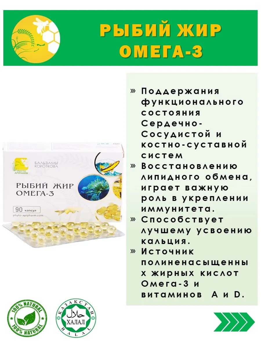 | Состав | Жир океанических рыб (Омега-3), желатин, глицерин, вода очищенная. |