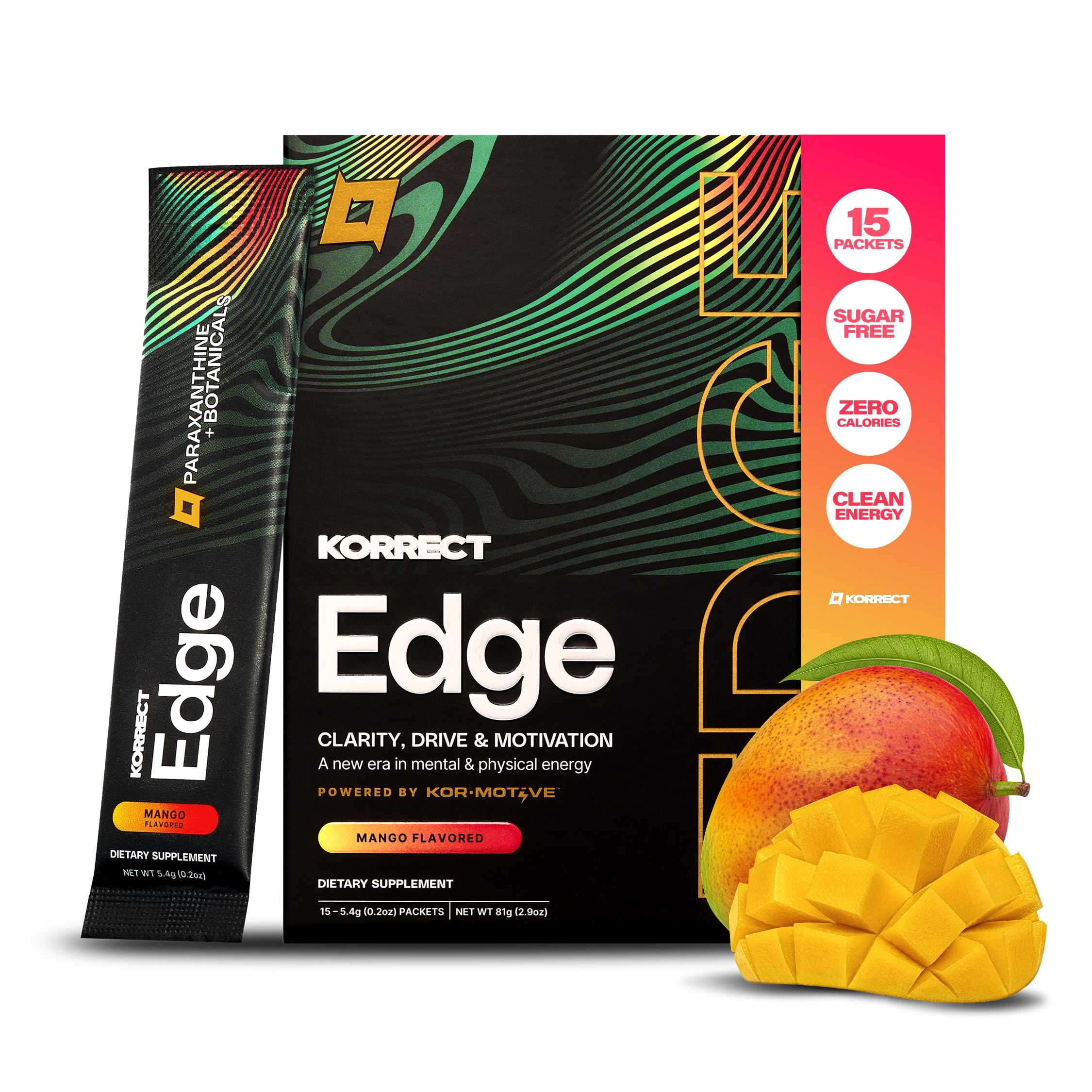 KORRECT Mental Performance Edge Powder (Mango) for Men & Women | Focus & Mental Clarity | Paraxanthine, Jitter-Free Energy | Non-GMO, cGMP Certified | 15 Packets 0.19 Ounce (Pack of 15)