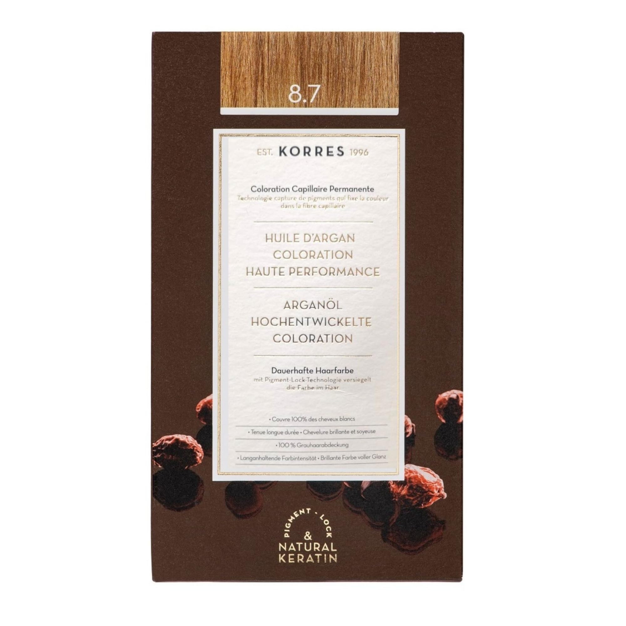 With ""Pigment-Lock"" technology that includes the color in the hair.With a controlled oxidation mechanism and without the use of ammonia, the color pigments penetrate into the innermost layers of hair and are held there.The hair shines long in intense colors that do not fade.With argan oil and natural keratin argan oil and natural keratin donate moisture into the deeper layers of hair and effectively protect the hair against damage.Hafer extract is rich in B vitamins and microminals that form a protective film and give the hair noticeably more strength and elasticity.application notes: Coloration not use in henna or metallic coloring.Wait until color has grown out.Exposure time for optimal 100 gray cover: 35-45 minutes, depending on the size of the hair.Choose the correct color: The result depends on the original hair color.Natural tones are suitable for covering gray hair.Choose the color max. Two nuances brighter darker as natural color.""Pigment-Lock"" technology: controlled oxidation mechanism without ammonia.Color pigments penetrate into the innermost layers of hair and are held there.The hair shines long in intense colors.Free from: Ammoniak, PPD, Resorcinol, Silicone, Paraben, mineral oil.Hair colors vegan, dermatologically tested, animal test -free.With argan oil keratin: argan oil natural keratin donate hair moisture, protecting effectively from damage.Hafer extract, rich in B vitamins and microminals, forms protective film, a noticeably more power and elasticity.Mit ""Pigment-lock""-Technologie, die die Farbe im Haar einschließt. Durch einen kontrollierten Oxidations-mechanismus und ohne den Einsatz von Ammoniak dringen die Farbpigmente bis in die innersten Haarschichten vor und werden dort festgehalten. Das Haar erstrahlt lang anhaltend in intensiven Farbtönen, die nicht verblassen. Mit Arganöl und natürlichem Keratin Arganöl und natürliches Keratin spenden bis in die tieferen Haarschichten Feuchtigkeit und schützen das Haar wirksam gegen Schädigungen. Haferextrakt ist reich an B-Vitaminen und Mikromineralien, die einen Schutzfilm bilden und dem Haar spürbar mehr Kraft und Elastizität verleihen.ANWENDUNGSHINWEISE: Coloration nicht verwenden bei Henna- oder metallischen Färbemitteln. Abwarten, bis Farbe herausgewachsen ist. Einwirkzeit für optimale 100 Grauabdeckung: 35-45 Minuten, je nach Haarstärke. RICHTIGEN FARBTON WÄHLEN: Das Ergebnis hängt von der ursprünglichen Haarfarbe ab. Natürliche Töne eignen sich für Abdeckung grauer Haare. Den Farbton max. zwei Nuancen heller dunkler als Naturfarbe wählen. ""PIGMENT-LOCK""-TECHNOLOGIE: Kontrollierter Oxidationsmechanismus ohne Ammoniak. Farbpigmente dringen bis in innerste Haarschichten vor, werden dort festgehalten. Das Haar erstrahlt lang anhaltend in intensiven Farbtönen. FREI VON: Ammoniak, PPD, Resorcinol, Silikon, Paraben, Mineralöl. Haarfarben vegan, dermatologisch getestet, tierversuchsfrei. MIT ARGANÖL KERATIN: Arganöl natürliches Keratin spenden Haaren Feuchtigkeit, schützen effektiv vor Schädigung. Haferextrakt, reich an B-Vitaminen und Mikromineralien, bildet Schutzfilm, verleiht spürbar mehr Kraft und Elastizität.KORRES Argan Oil Colorant - ammoniakfreie Haarfarbe Toffee 8.7-100 Grauhaarabdeckung vegan für ein langanhaltendes Farbergebnis
