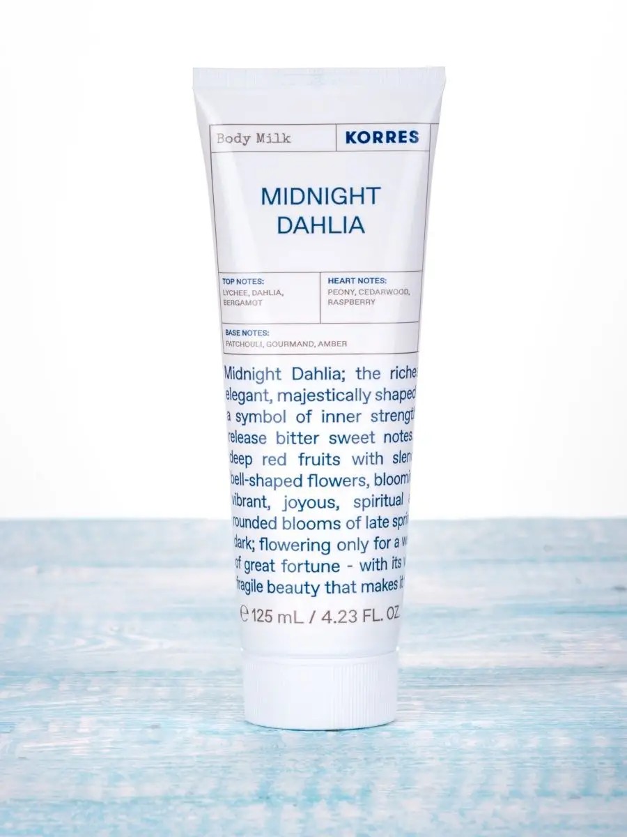 Immerse yourself in an atmosphere of mysterious floral seduction with the Midnight Dahlia body lotion from the Greek brand KORRES.