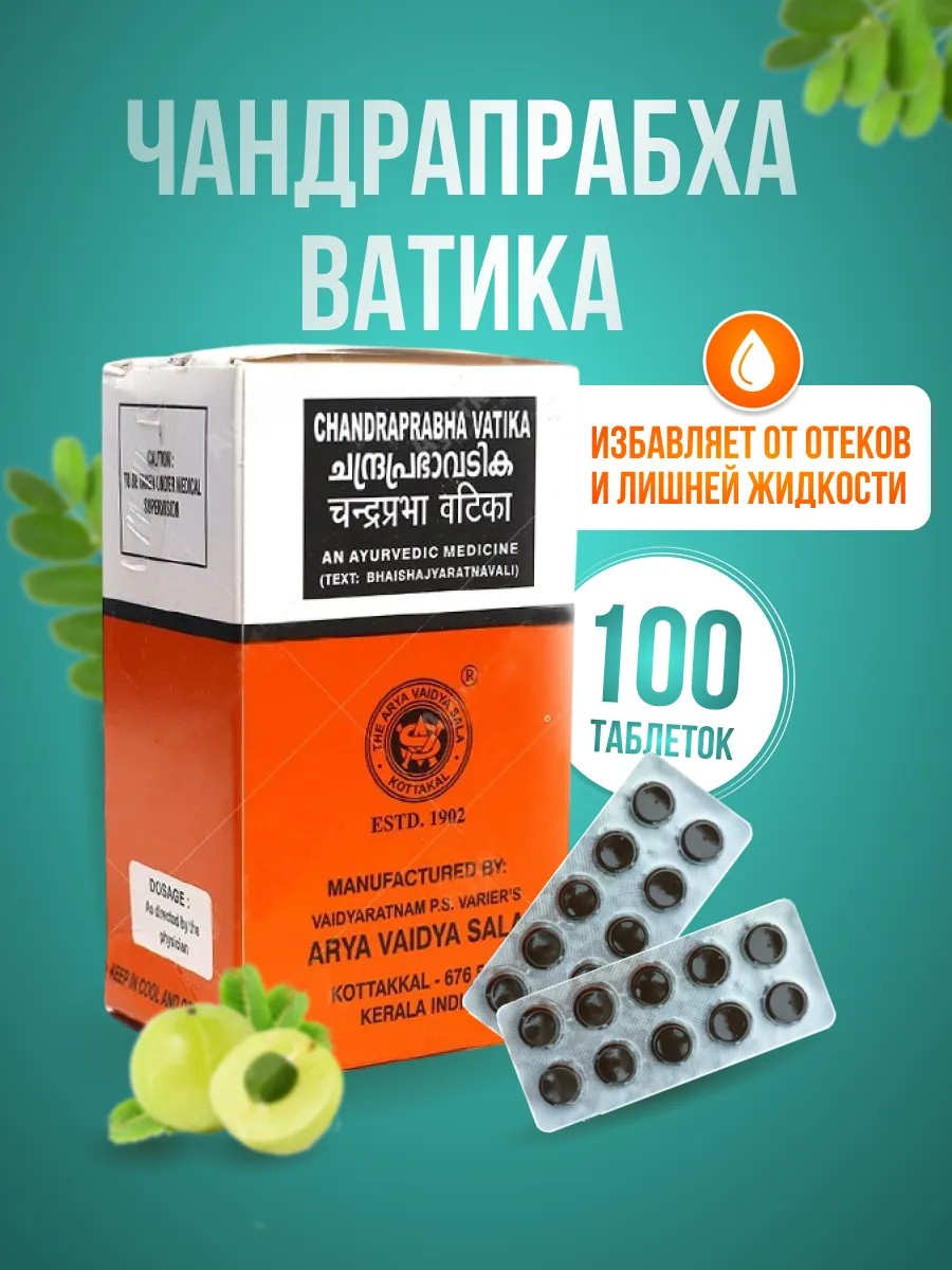 | Комплектация | Chandraprabha Vatika Kottakkal 100таб. в фирменной коробке. для мочеполовой системы; Чандрапрабха Ватика мочегонное от отеков в фирменной упаковке 100таб. |