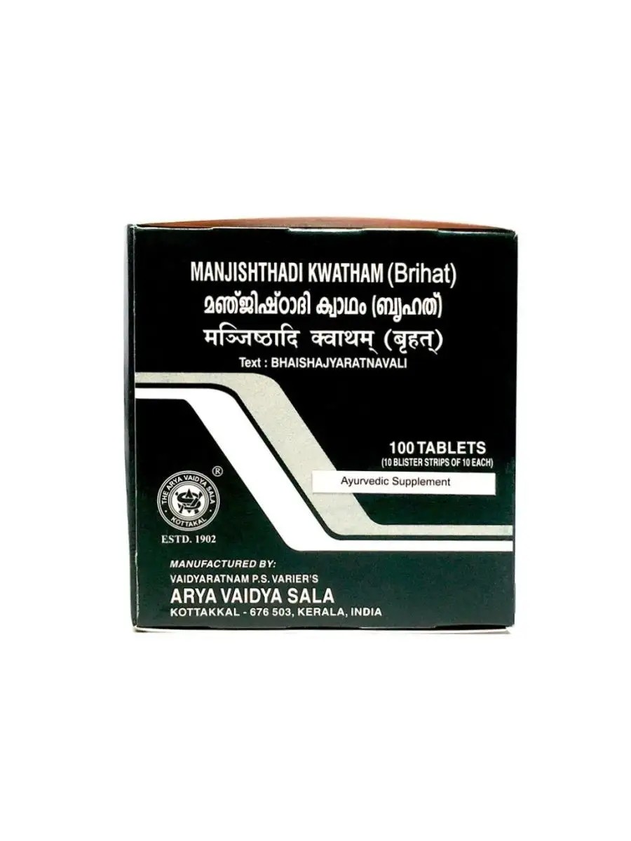 Манджиштхади Кватхам Коттаккал (Manjishthadi Kwatham Kottakkal) для очищения крови, при кожных заболеваниях, 100 таб. – натуральный препарат широкого спектра действия, направленный, в первую очередь, на очищение крови и улучшение ее состава. Средство снижает Пита дошу, охлаждает кровь, выводит шлаки и токсины, останавливает кровотечения, предотвращает развитие тромбозов, снимает зуд и жжения. Manjishthadi Kwatham Arya Vaidya Sala Kottakkal поможет снять воспаления крови и оздоровит женскую репродуктивную систему.