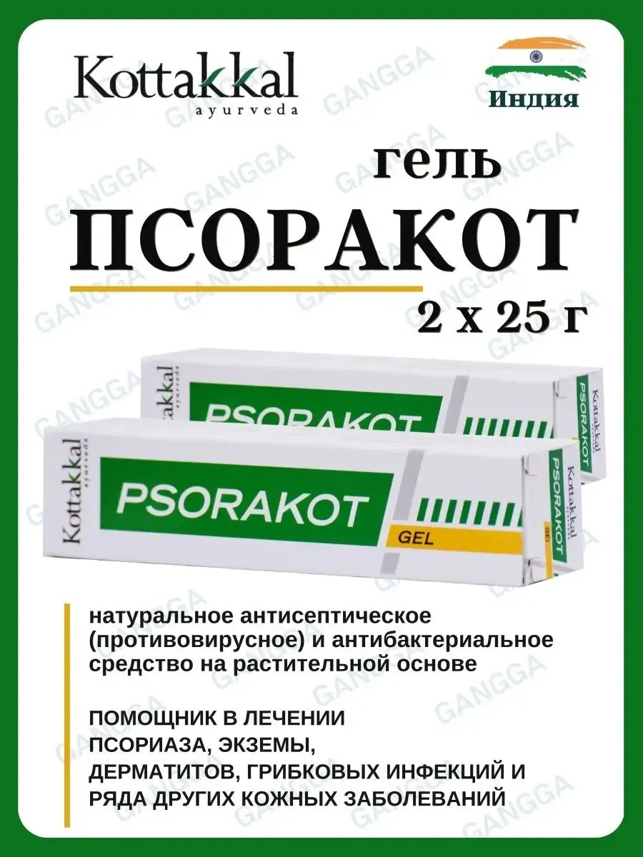 Псоракот гель Коттаккал (Аюрведа) помогает от псориаза, экземы, дерматитов, грибковых инфекций и ряда других кожных заболеваний. Это натуральное антисептическое (противовирусное) и антибактериальное средство на растительной основе с длительным и стойким эффектом. Он бережно оказывает лечебное действие и при этом действует как косметика: увлажняет кожу. Также индийское средство успешно борется с грибком стопы. В составе действенные травы и компоненты. Это сильное антисептическое и глистогонное средство, ускоряющее заживление ран и избавляющее от паразитов. Кокосовое масло прекрасно справляется с высыпаниями на коже, угрями, прыщами, черными точками, увлажняет, смягчает и питает сухую кожу, устраняет шелушение. Применение: наносить на пораженные участки кожи 2-4 раза в день, после применения дать впитаться, не смывать. Минимальный курс: 10 дней. Для достижения более эффективного результата применяйте также таблетки Псоракот.