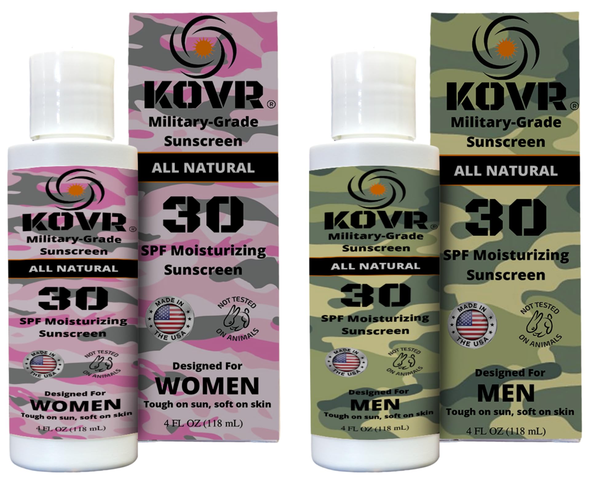Kovr Military-Grade Sunscreen Combo Pack features Kovr Green for men and Kovr Pink for women, both broad spectrum, all-natural SPF 30 sunblock lotions.