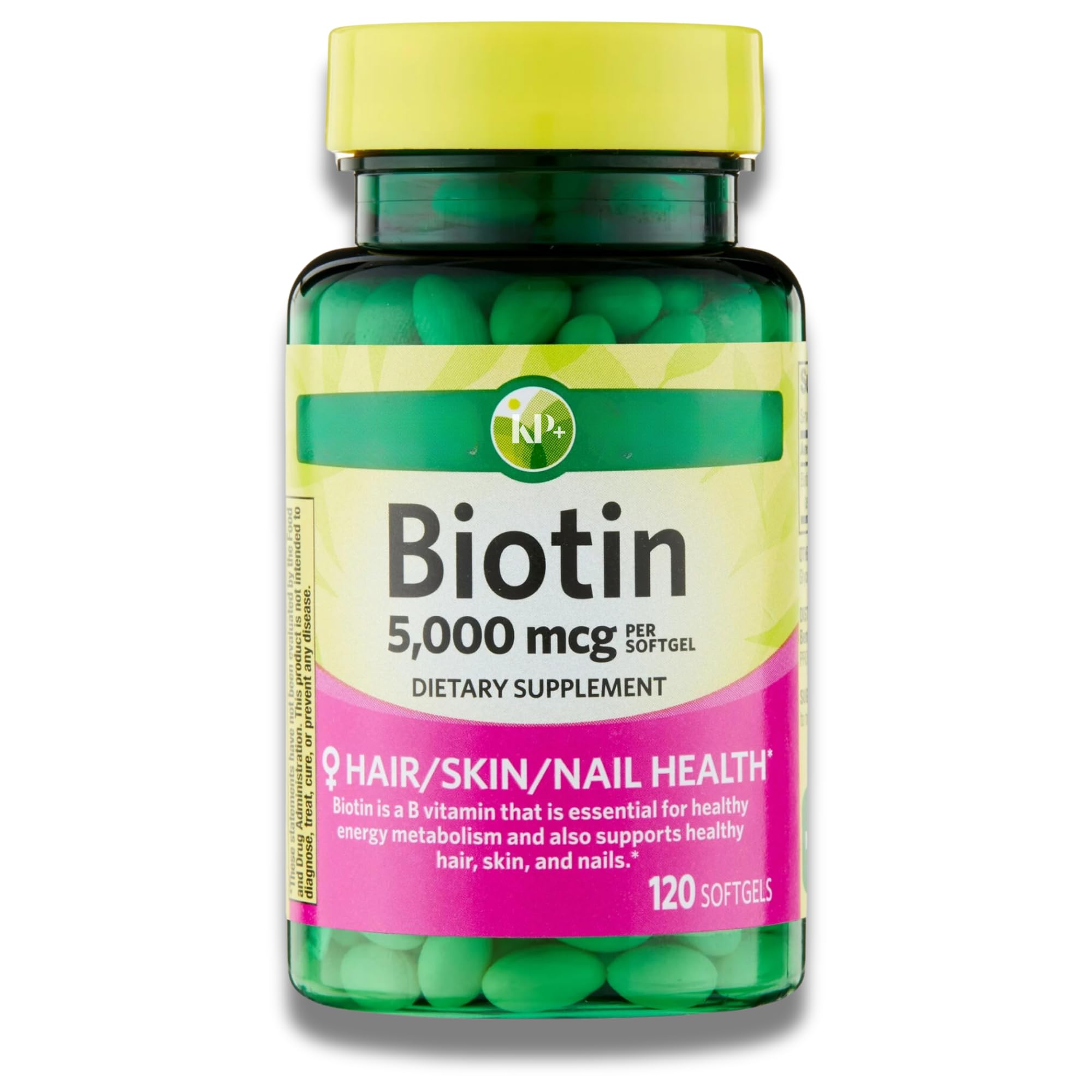 KP Biotin 5,000 mcg is a high-quality dietary supplement designed to support healthy hair, radiant skin, and strong nails. Each softgel delivers 5,000 mcg of biotin, an essential B vitamin that plays a key role in energy metabolism and helps convert nutrients into energy your body can use daily. Biotin is water-soluble and supports the natural processes that promote beauty from within, making it an excellent choice for those looking to maintain vibrant hair, smooth skin, and healthy nails. This gluten-free formula contains no artificial colors, flavors, or preservatives, offering purity and reliability you can trust from KP Wellness Vitamins. ? These statements have not been evaluated by the Food and Drug Administration. This product is not intended to diagnose, treat, cure, or prevent any disease.5 ? 4-Month Supply – Each bottle contains 120 softgels, offering a generous four-month supply of Biotin for ongoing hair, skin, and nail support. . 4 ? Easy-to-Swallow Softgels – Convenient softgel form designed for smooth, easy ingestion and consistent daily nutrient intake. . 3 ? Gluten-Free Clean Quality – Made without gluten, lactose, or artificial colors and flavors. A pure formula designed for daily use and all lifestyles. . 2 ? Nourishing Formula – Each softgel provides 5,000 mcg of Biotin, an essential B vitamin that supports energy metabolism and overall wellness. . 1 ? Hair, Skin Nail Support – Biotin helps support healthy hair growth, radiant skin, and strong nails as part of your daily beauty routine. .