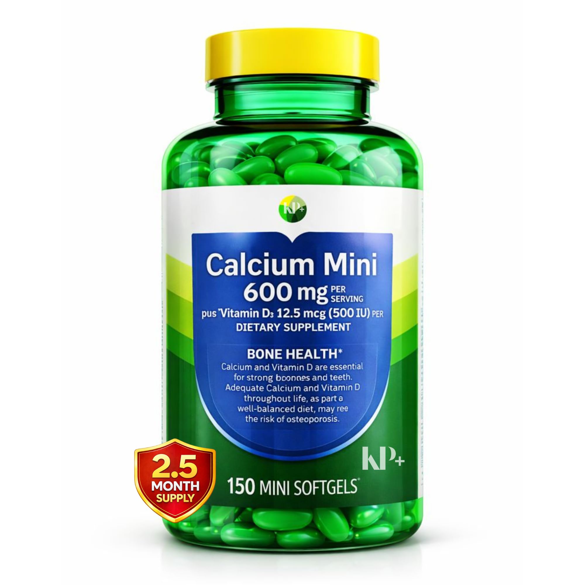 KP+ Calcium Mini 600 mg Plus Vitamin D3 12.5 mcg (500 IU) | Bone & Teeth Health Support | Dietary Supplement | 150 Mini Softgels | Pack of 1