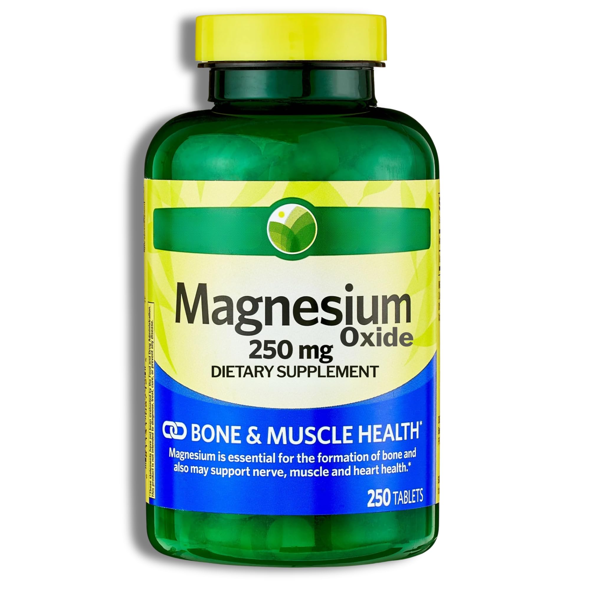 Magnesium Oxide 250 mg is a daily dietary supplement formulated to promote bone strength, muscle performance, and nerve function. Each tablet contains 250 mg of Magnesium Oxide, a key mineral that the body uses for hundreds of essential biochemical processes, including energy production, calcium regulation, and muscle relaxation. Magnesium Oxide is one of the most efficient forms for replenishing magnesium levels, making it ideal for those who may not get enough magnesium from diet alone. Regular intake helps support strong bones, proper muscle contraction, steady heart rhythm, and overall nervous system balance. With 250 tablets per bottle, this value-size supplement ensures consistent magnesium support for everyday health, helping you feel balanced, energized, and strong. ? Disclaimer: These statements have not been evaluated by the Food and Drug Administration (FDA). This product is not intended to diagnose, treat, cure, or prevent any disease. Consult your healthcare provider before starting any new supplement.5 ? Value Size Bottle: Includes 250 tablets, providing long-term supply and dependable support for your bone, nerve, and muscle health. 4 ? Essential Mineral for Wellness: Supports heart rhythm, enzyme function, and helps the body utilize nutrients effectively — ideal for daily wellness routines. 3 ? ? Nerve Energy Function: Magnesium plays a vital role in nerve transmission and energy production, helping your body function efficiently throughout the day. 2 ? Bone Muscle Support: Helps maintain strong bones and proper muscle function, supporting overall body strength and daily mobility. 1 ? ? Magnesium Oxide Formula: Each tablet provides 250 mg of Magnesium Oxide, an essential mineral that supports bone, muscle, and nerve health while promoting proper calcium balance in the body.