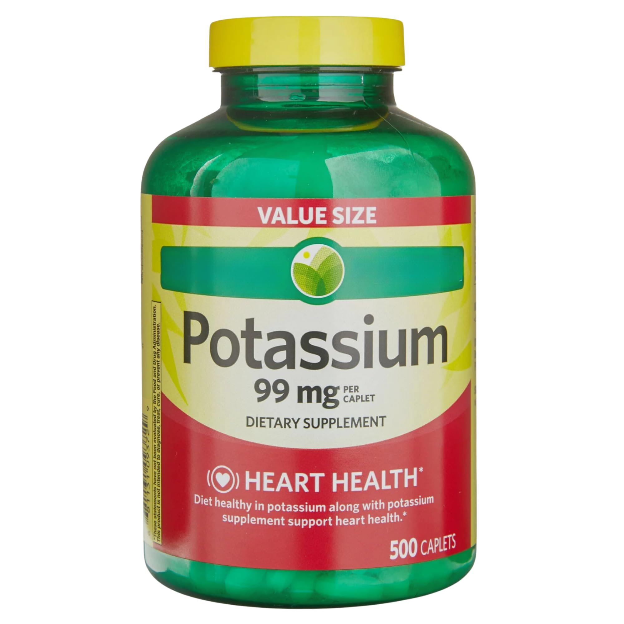 5 ? Daily Dietary Supplement: Formulated as a simple once-daily caplet to complement a balanced diet and support overall wellness and vitality. . 4 ? Value Size 500 Caplets: Large bottle with 500 caplets offers long-lasting supply and convenient daily use as part of your nutritional routine. . 3 ? Mineral Balance: Helps support the body's natural electrolyte balance, contributing to normal nerve and muscle activity throughout the day. . 2 ? ? Heart Health Support: Potassium plays an important role in helping maintain normal heart function and supporting overall cardiovascular wellness. . 1 ? Potassium 99 mg: Provides 99 mg of potassium per caplet to support normal heart and muscle function as part of your daily wellness routine. .