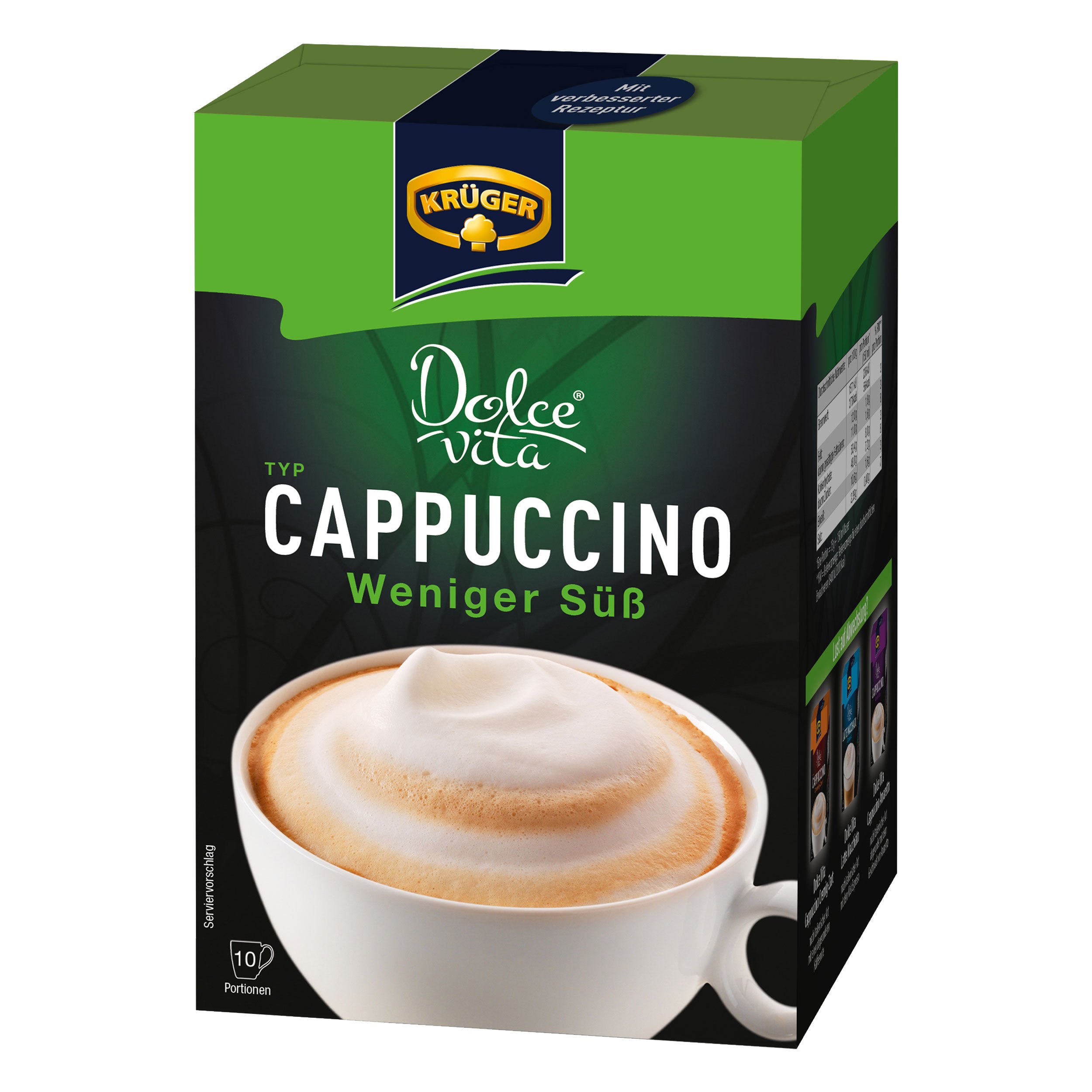 Krüger Dolce Vita Type Capuccino Less sweet. In an Italian way with a rounded coffee note. Powdered drink with soluble coffee. Preparation: put the contents of one sachet (15 g) in a cup and pour into hot water which is no longer boiling (150 ml) and stir - it's ready. Note for allergy sufferers: contains milk (including lactose) and products derived from it, ingredients: sweet whey powder, soluble coffee beans (14 ), coconut fat, skimmed milk powder, maltodextrin, acidity regulator sodium hydrogen, stabilizer sodium phosphate, salt. Note for allergy sufferers: contains milk (including lactose) and products derived from it. Box contents: 1 pack Krüger Dolce Vita Cappuccino, less sweet, coffee with milk, soluble coffee beans, 10 bags of 150 g pack of 15 g portion bag INGREDIENTS NOLLIQUE SUGAR POWDER, soluble bean coffee (14 ), coconut fat, SKIMMING MILK POWDER, maltodextrin, acidity regulator: sodium hydrogen carbonate, stabilizer: sodium phosphate, salt.Ingredients: Whey powder, instant coffee beans (14 ), coconut fat, skimmed milk powder, maltodextrin, acidity regulator sodium carbonate, stabilizer sodium phosphate, salt. Allergy warning: Contains milk (including lactose) and milk products. Krüger Dolce Vita Type Capuccino Moins de sucré. D'une manière italienne avec une note de café arrondie. Boisson en poudre avec café soluble. Préparation : mettre le contenu d'un sachet (15 g) dans une tasse et verser dans de l'eau chaude qui ne fait plus bouillante (150 ml) et remuer - c'est prêt. Remarque sur les personnes allergiques : contient du lait (y compris le lactose) et des produits qui en résultent, ingrédients : poudre de lactosérum doux, café de grains soluble (14 ), graisse de coco, lait écrémé en poudre, maltodextrine, régulateur d'acidité hydrogène de sodium, stabilisateur phosphate de sodium, sel. Remarque sur les personnes allergiques : contient du lait (y compris le lactose) et des produits qui en résultent. Contenu de la livraison : 1 paquet Krüger Dolce Vita Cappuccino, moins de sucré, café au lait, café à base de grains soluble, 10 sachets de 150 g paquet de 15 g sachet de portions INGRÉDIENTS POUDRE DE NOLLIQUE SUCRE, café de haricots soluble (14 ), graisse de coco, LAIT ÉCRMAGER POUDRE, maltodextrine, régulateur d'acidité : hydrogénocarbonate de sodium, stabilisant: phosphate de sodium, sel.Ingrédients : poudre de lactosérum, café à grains solubles (14 ), graisse de coco, lait écrémé en poudre, maltodextrine, régulateur d'acidité carbonate de sodium, stabilisateur phosphate de sodium, sel. Avertissement pour les personnes allergiques : contient du lait (y compris du lactose) et des produits dérivés.
