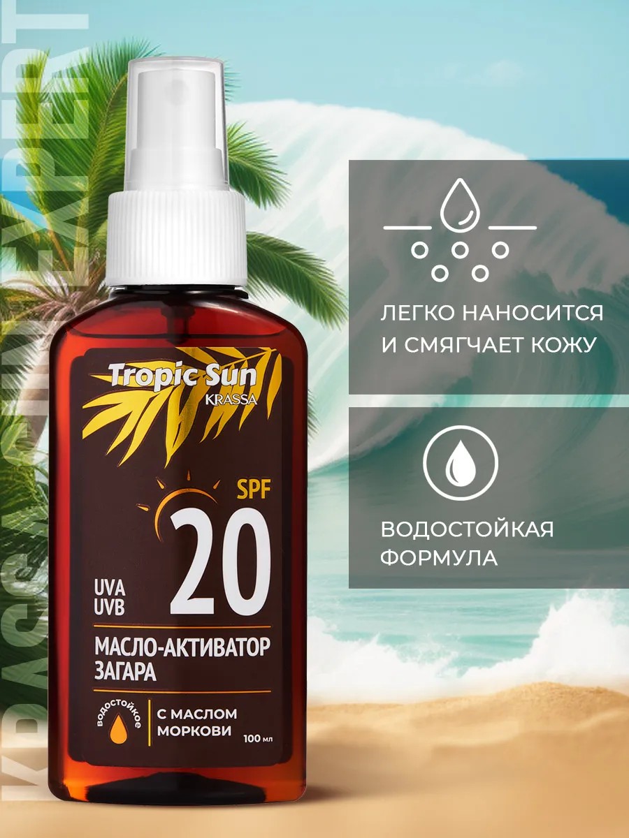Теперь красивая и здоровая кожа доступна каждому! Масло-активатор загара KRASSA TROPIC SUN с уровнем защиты SPF 20 предлагает новый уровень заботы о вашей коже. Разработанное с применением инновационных технологий и высококачественных натуральных масел, это средство становится вашим надежным помощником в борьбе за идеальный загар.¶Уровень SPF 20 защищает кожу от вредного воздействия ультрафиолетовых лучей, позволяя получать ровный и безопасный загар. Содержит натуральные масла и витамины, необходимые для стимуляции естественного процесса образования мелатонина. Активизирует выработку меланина, ускоряя появление здорового золотистого оттенка кожи.¶Натуральный аромат манго и кокоса перенесет вас прямо на тропические острова, вызывая приятные ассоциации с отдыхом и расслаблением. Легкая текстура мгновенно впитывается, не оставляя жирного слоя и ощущения липкости.¶Масло KRASSA TROPIC SUN способствует активации естественной выработки меланина в клетках кожи, помогая быстрее достичь желаемого уровня загара. Натуральные растительные экстракты и витамин E укрепляют защитные механизмы кожи, уменьшая риск повреждений и пигментации. Все это обеспечивает безопасность и эффективность загара, даже при длительном пребывании на солнце.¶