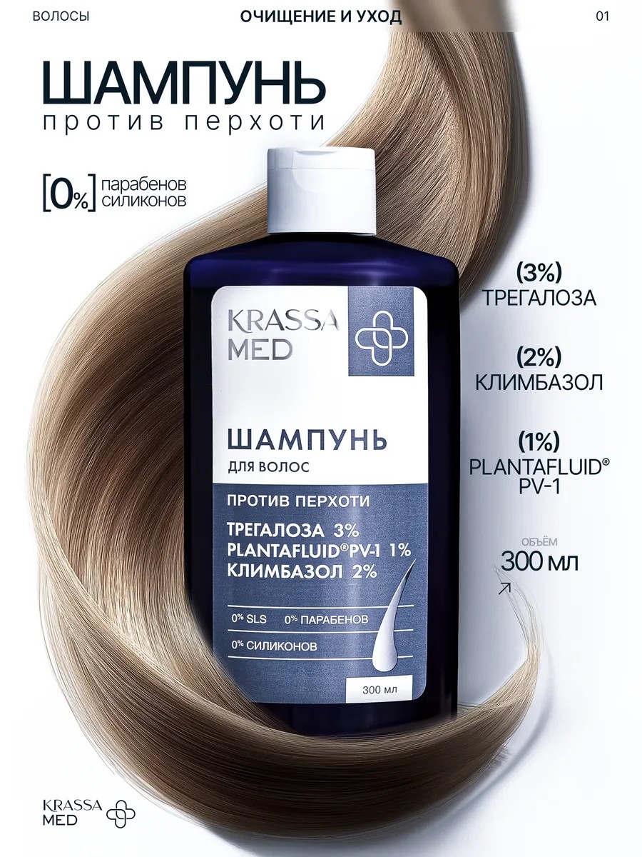 KRASSA MED Anti-Dandruff Shampoo with Climbazole + Trehalose, 300 ml, is an effective treatment for dandruff. Thanks to the unique combination of Climbazole and Trehalose, this shampoo not only helps eliminate dandruff but also promotes healthy hair. Suitable for all hair types, including color-treated and those prone to hair loss, it provides gentle exfoliation and a cooling scalp. The shampoo's formula is designed to minimize irritation and promote overall hair and scalp health. By choosing KRASSA MED, you're choosing a reliable anti-dandruff solution that will help your hair look healthy and shiny.