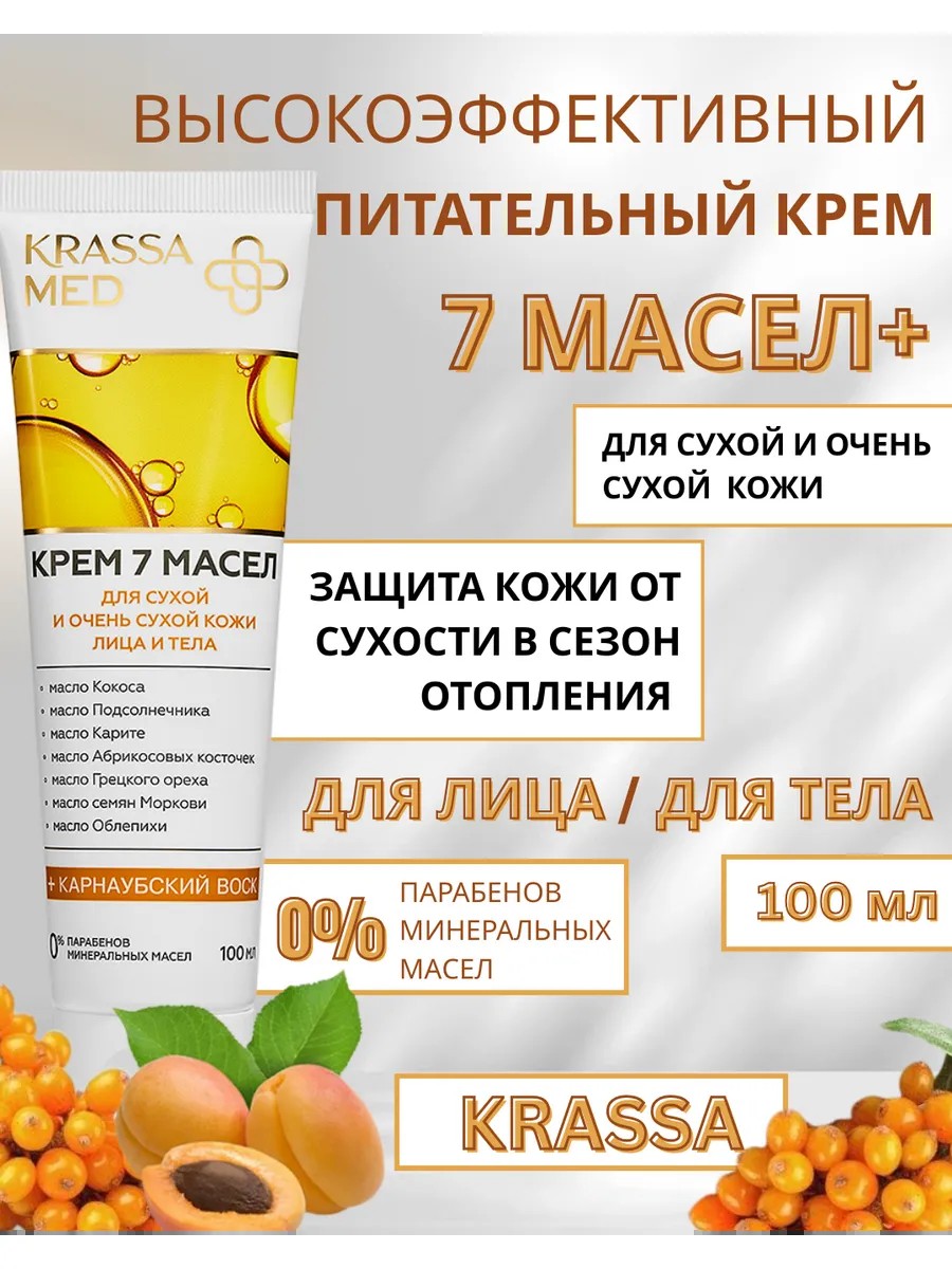 KRASSA MED Крем 7 масел+ – это универсальное питательное средство для ухода за сухой и очень сухой кожей лица и тела. Формула обогащена семью ценными маслами и натуральным карнаубским воском, которые обеспечивают интенсивное питание, восстановление и защиту кожи.