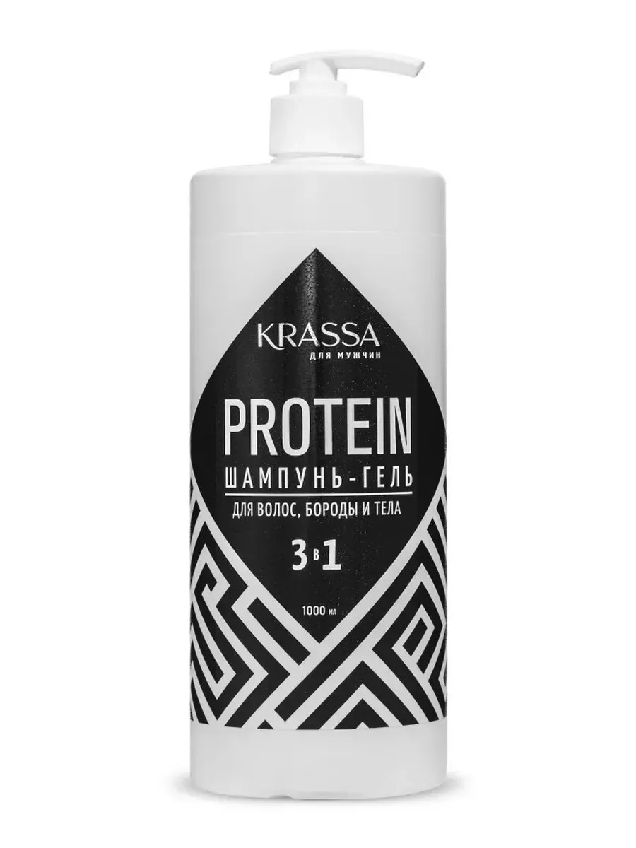 KRASSA Professional, 3-in-1 Men's Shampoo-Gel for Beard and Body, 1000 ml, 1 bottle. One bottle, one solution. This multifunctional product for hair, beard, and body is specially formulated to cleanse, nourish, and deeply moisturize men's skin. Active ingredients: Hydrolyzed protein is vital for hair and skin as it is a natural protein. It is easily absorbed into the hair shaft and follicle, increasing elasticity and flexibility.