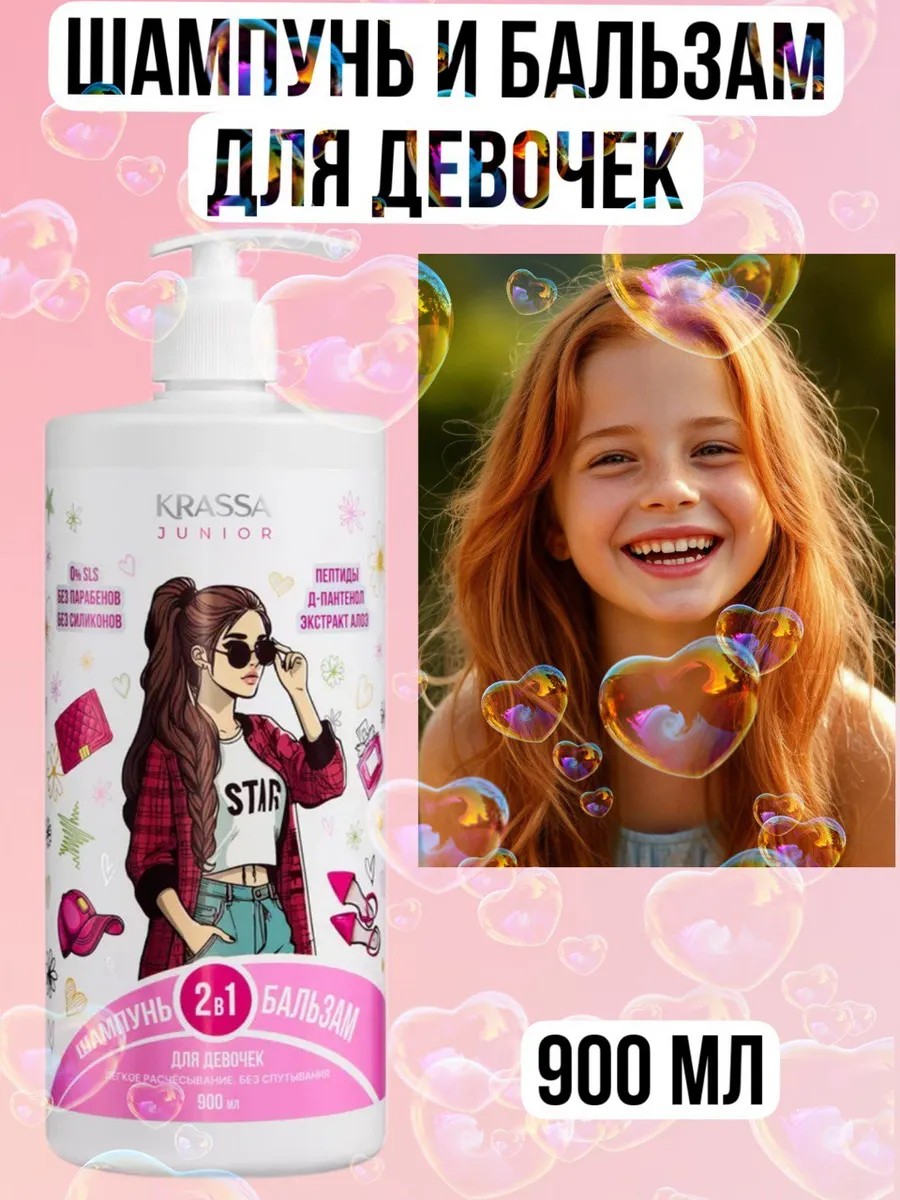 KRASSA Шампунь и бальзам детский для волос 2в1 для девочек