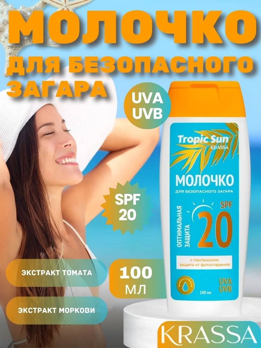 Молочко TROPIC SUN с SPF 20 — это идеальное средство для защиты кожи от солнечного излучения, обеспечивая среднюю степень защиты от УФ-лучей. Оно специально разработано для людей с нормальной и слегка чувствительной кожей, которые хотят получить безопасный загар, не рискуя повреждением кожи.