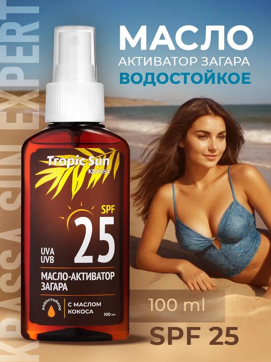 Масло-активатор водостойкое для загара SPF 25 100 мл Витаминизированное косметическое масло с экстрактом кокоса является прекрасным средством для получения ровного и стойкого загара вашего красивого тела. Прекрасные барьерные свойства обеспечивают защиту от УФ-лучей и поддерживают природный уровень влаги в коже. Витамины обладают антиоксидантным действием и предотвращает фотостарение кожи. Масло красса легко наносится и быстро впитывается. Предназначено для всех типов кожи.