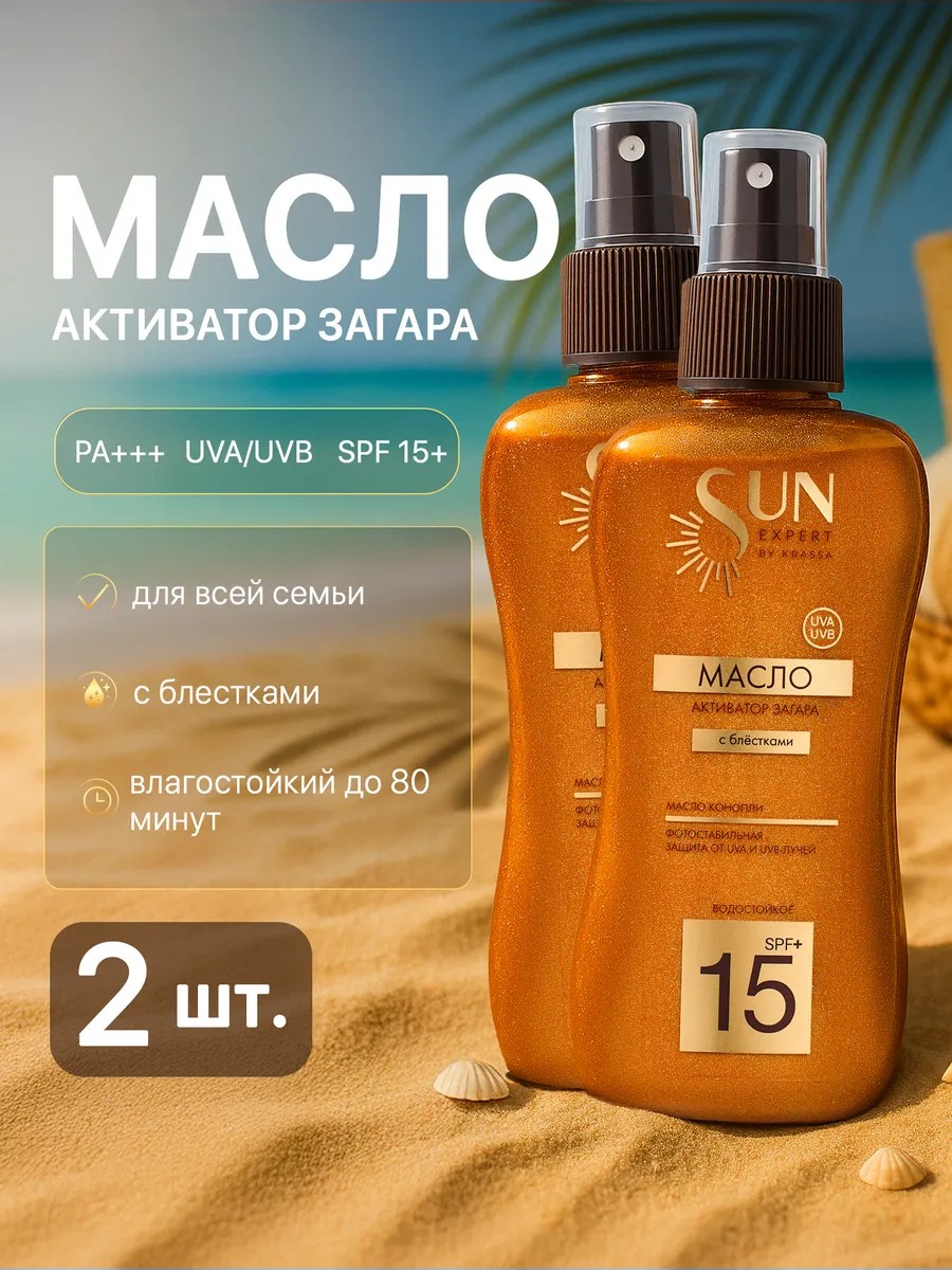 An intense tan with optimal protection! Tanning activator oil SPF 15 is a cosmetic oil designed to help you achieve a beautiful, even tan without damaging your skin. KRASSA tanning product provides ultra-high protection against UVA/UVB rays and free radicals, and protects skin from dehydration caused by sun exposure. This sun-protective tanning oil provides moderate UV protection, so your skin not only tans but also stays healthy and hydrated. This shimmery body oil is available in a spray, making it convenient and economical to use. Hemp oil is rich in antioxidants, valuable oils, vitamins, and minerals, nourishing and deeply moisturizing the skin, protecting it from drying out. A photostable complex of UVA/UVB filters effectively protects the skin from the harmful effects of UV rays. Glitter imparts a beautiful golden glow to the skin and enhances the tanning effect. For dark and already tanned skin. Absorbs quickly and is non-sticky. Shake before use. This tanning spray has a waterproof formula, making it ideal for the beach and pool. Directions: Shake the bottle, evenly distribute the glitter oil over the skin, and reapply periodically. Precautions: Individual intolerance to any of the ingredients is possible. Do not apply the tanning oil spray to the eye area. In case of contact with eyes, rinse immediately with water. Avoid contact with clothing until completely absorbed. The oil is an excellent daytime skin care product, just like sunscreen and lotion. Recommendations: Safe tanning times are before 11:00 AM and after 4:00 PM. Avoid sun exposure during peak UV activity. Sunscreen should be reapplied every hour, after swimming and/or towel drying.