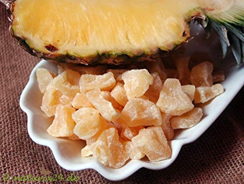 Dried fruit is highly prized by many people. And for good reason: it is indeed very rich in vitamins. It is characterized by a complete absence of harmful substances. In addition, these fruits have a rich and unsurpassed taste. Slightly sweet, they melt on the tongue and leave an incomparable fruity flavor. This is no surprise, as the pineapple is harvested fully ripe. This is the only way the pineapple pieces can fully develop their nutrients. A perfectly ripe pineapple is also characterized by a fruity acidity and aromatic sweetness. As dried fruit, pineapple pieces can be stored for up to a year. With these qualities, they are always suitable for a pleasant meal, as well as for use as a baking ingredient. Thanks to the exclusive use of fully ripe fruit, essential minerals are preserved for the customer. Our pineapple pieces are rich in magnesium, potassium, and calcium, and of course, they also contain trace elements such as iron, zinc, and manganese. Furthermore, with small amounts of vitamin A, B vitamins, and vitamin C, our pineapple possesses all the properties that distinguish it as a high-quality food. These pineapple pieces also contain sufficient enzymes, such as bromelain. It's safe to say that pineapple as a dried fruit is a true delight for the palate. This also applies to eating these dried fruits. Sweetened pineapple pieces are an ideal addition to traditional desserts.Krauterino24 - Ananas coudés non tissés - Quantité : 250 gDESCRIPTION DU PRODUIT Les fruits secs sont très élevés chez de nombreuses personnes. C'est pour une bonne raison : ils sont en effet très riches en vitamines. Elles se caractérisent par une totale absence de substances nocives. À cela s'ajoute un goût riche et insurpasse de ces fruits. Légèrement sucrées, elles se fondent sur la langue et laissent une saveur fruitée incomparable. Ce n'est pas étonnant, l'ananas est récolté entièrement mûr. C'est la seule façon que les morceaux d'ananas peuvent développer pleinement leurs nutriments. Un ananas bien mûre se caractérise également par un acide fruité et une douceur aromatique. En tant que fruits secs, les morceaux d'ananas peuvent être conservés pendant une bonne année. Avec ces qualités, ils sont toujours adaptés pour un repas agréable, mais aussi comme ingrédient de pâtisserie. Grâce à l'utilisation exclusivement de fruits entièrement mûrs, les minéraux essentiels sont conservés pour le client. Nos morceaux d'ananas sont donc riches en magnésium, potassium et calcium, et bien sûr, les oligo-éléments tels que le fer, le zinc et le manganèse ne sont pas trop courts. En outre, avec de faibles traces de vitamine A, de vitamines du groupe B et de la vitamine C, notre ananas possède toutes les propriétés qui les distinguent comme un aliment de haute qualité. Ces morceaux d'ananas contiennent également suffisamment d'enzymes comme par exemple l'enzyme broméline. On peut dire avec le joint et le droit : l'ananas comme fruit sec est un véritable plaisir de palais. Cela vaut également si ces fruits secs sont consommés. Les morceaux d'ananas sucrés représentent ici une variante idéale pour les plats sucrés traditionnels.