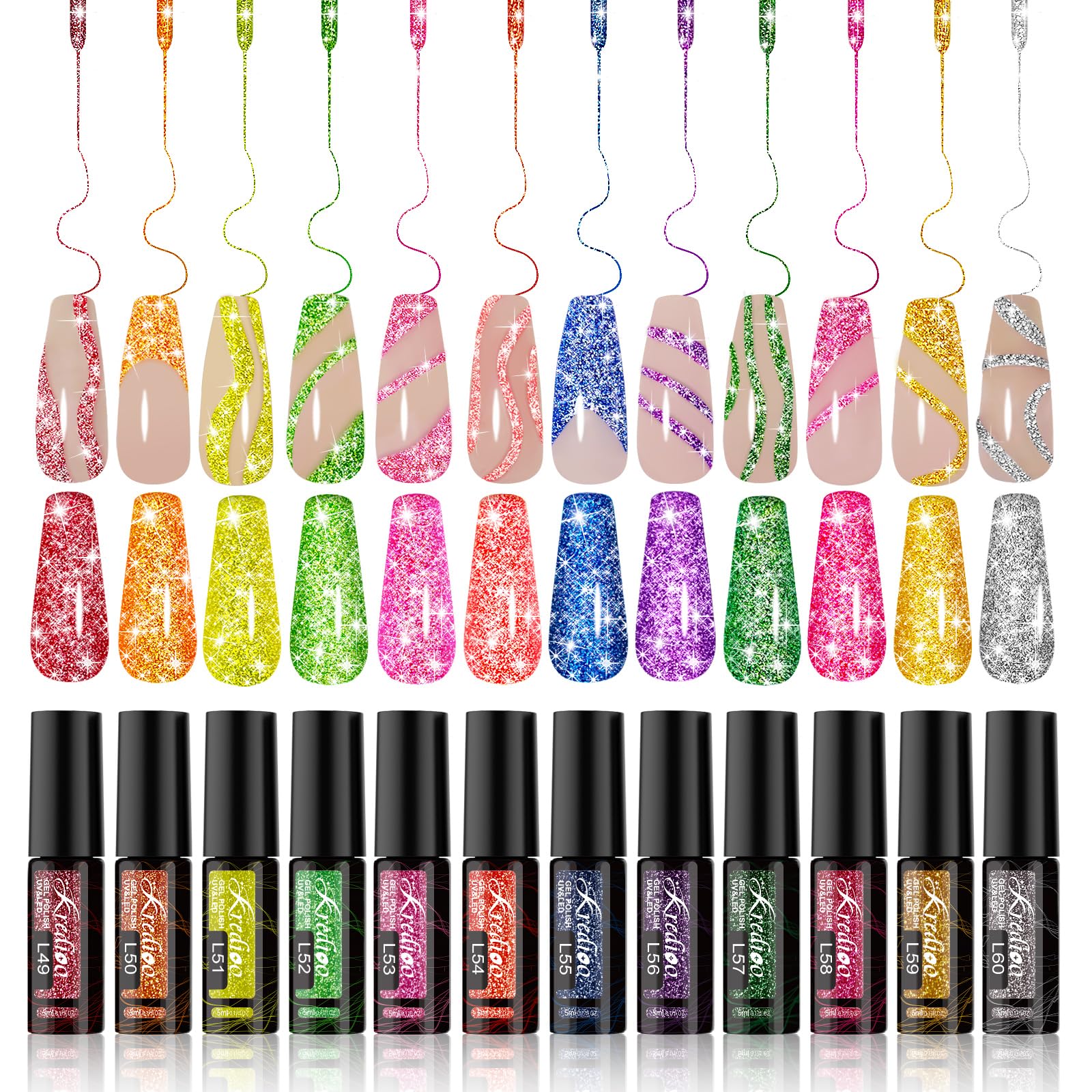 Kredioo Reflective Glitter Gel Nail Polish Gel Liner Nail Art Polish Sparkle Flash Diamond Painted 12 Colors UV Lamp Cured Soak-off Polish Golden Pink Silver Neon DIY Home Salon Manicure Gel Glitter Gel Liner 12