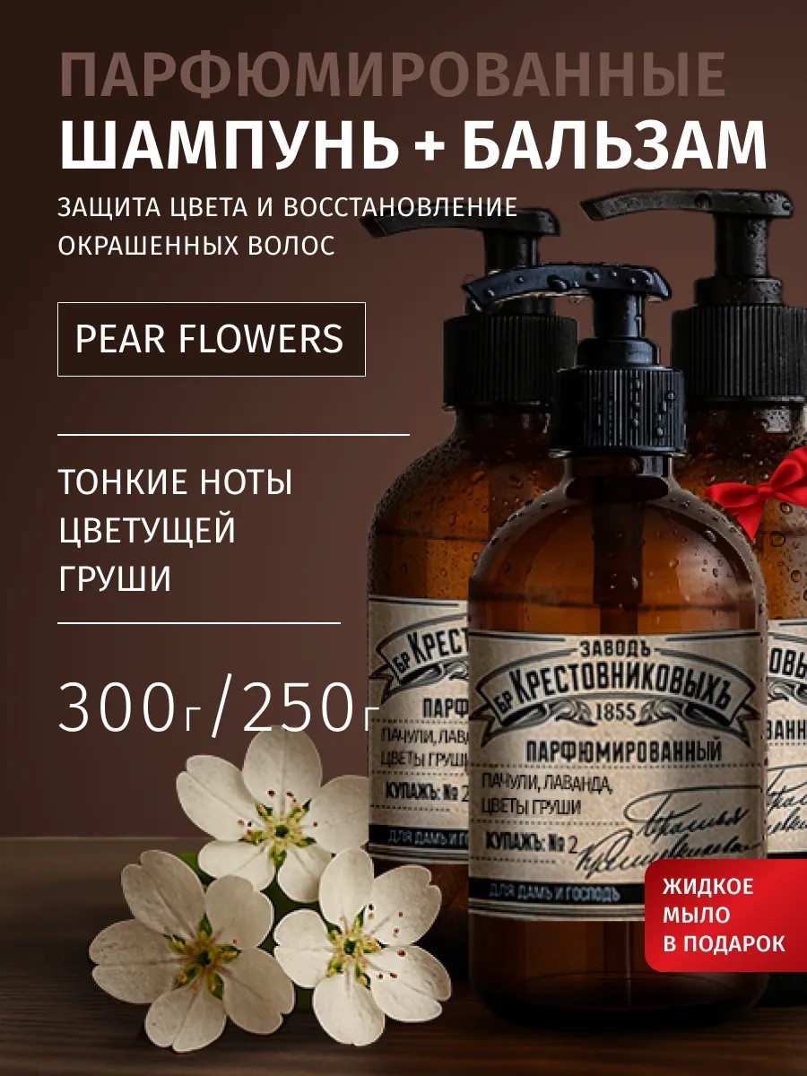 Подарочный набор для женщин бренда Завод Братьев Крестовниковых это изумительный Купаж ароматов Пачули, Лаванда, цветы Груши. Шампунь предназначен для всех типов волос, в том числе поврежденных и окрашенных. Шампунь укрепляет волосы, дарит гладкость и блеск, насыщает питательными элементами. Бальзам обогащен активными компонентами, которые питают и увлажняют волосы, восстанавливают секущиеся кончики волос. Волосы выглядят здоровыми и сияющими. После использования бальзама волосы легко расчесываются, что предотвращает выпадение волос из-за механического повреждения. Глицерин в составе шампуня и бальзама оказывает увлажняющее действие, волосы становятся упругими и пышными без утяжеления. Жидкое мыло деликатно ухаживает за кожей рук, оказывает тонизирующее действие. Эффективно смывает любые загрязнения и отлично пенится. Тропические масла в составе жидкого мыла тонизируют и защищают кожу от преждевременного старения. Вместе шампунь, бальзам и жидкое мыло - незаменимая косметика для полноценного ухода за волосами и кожей. Идеальный подарочный набор для ваших близких на 8 марта, день рождения и на все праздники. Набор уходовой косметики, уходовая косметика: бальзам для волос женский, женский шампунь (мужской шампунь), мыло жидкое