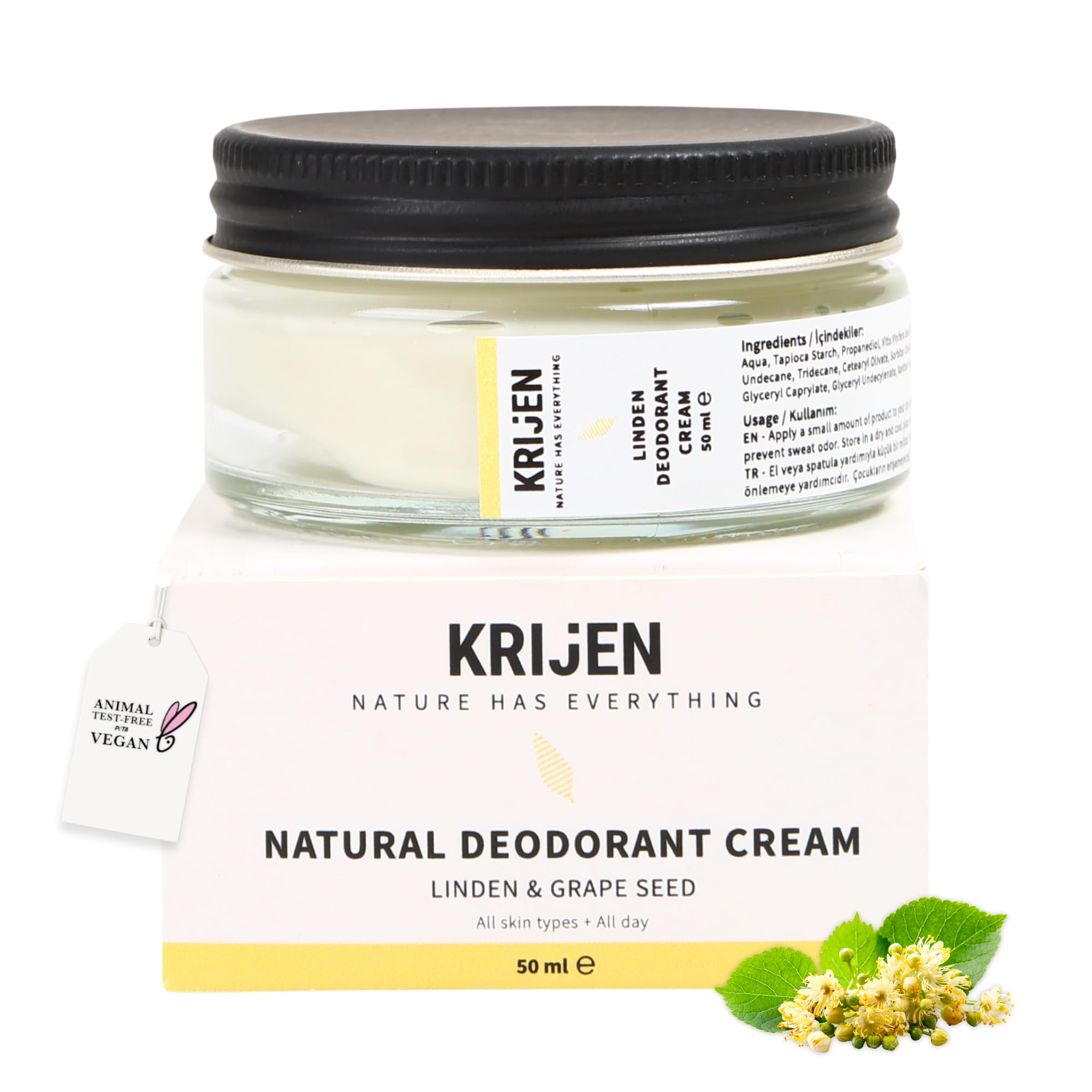 Krijen Linden Blossom Cream Deodorant 50ml Aluminum-Free Vegan Anti-Perspirant Anti-Stain For Sensitive Skin For Men and Women Gentle on Skin, Powerful Anti-Odor DIRECTIONS FOR USE Clean and dry the underarm area before application. Apply a thin, even layer to the underarm area. Allow the deodorant to dry completely before dressing. If necessary, reapply during the day or after physical activity. SAFETY WARNING No. See moreVegan, cruelty-free, and handmade – Ethical care – Krijen deodorants are handmade in small batches. The vegan formula contains no animal-derived ingredients and is never tested on animals. Made with a focus on quality, transparency, and ethical values. No residue – Convenient and stain-free. The creamy consistency is easy to apply, absorbs quickly, and leaves no residue on light or dark clothing. Also ideal for travel – Safe to carry with no risk of leakage. Made in Turkey. Eco-friendly packaging: Plastic-free and zero-waste oriented. The packaging is entirely plastic-free and made from recyclable materials. Compared to liquid deodorants, this solid option is more sustainable – a deliberate choice for environmentally conscious users who value sustainability. Ideal for sensitive skin: Soothing, non-irritating cream texture specially designed for sensitive and easily irritated skin. The alcohol-free formula won't sting, even after shaving. The soft cream texture leaves a nourishing film on the skin, promotes moisture balance, and provides a feeling of softness. Strong odor protection: long-lasting effect in harmony with the skin's natural balance, the plant-based active ingredients offer lasting protection against unpleasant body odor. They form a natural protective barrier on the skin's surface without clogging pores, effectively preventing odor formation. The skin's natural flora remains intact, a clear benefit for sensitive skin. Natural freshness: linden blossom fragrance and pure plant ingredients – Krijen Linden Blossom Cream Deodorant brings the soothing power of nature to your daily skincare routine. The gentle fragrance, inspired by linden blossoms, leaves a feeling of freshness under the arms and also has a mentally refreshing effect. Aluminum-free, paraben-free, fragrance-free, and alcohol-free. Enriched with skin-friendly plant-based ingredients.Krijen Déodorant crème à la fleur de tilleul 50 ml Sans aluminium végétalien Contre la transpiration et les taches Pour peaux sensibles Pour homme et femme Doux pour la peau et puissant 50 ml (1er Pack) Parfum crème de tilleulDESCRIPTION DU PRODUIT DESCRIPTION DU PRODUIT Krijen Déodorant crème à la fleur de tilleul 50 ml Sans aluminium végétalien Contre la transpiration et les taches Pour peaux sensibles Pour homme et femme Doux pour la peau et puissant contre les odeurs MODE D'EMPLOI Nettoyez et séchez la zone des aisselles avant l'application. Appliquez une fine couche uniforme sur la zone des aisselles. Laissez le déodorant sécher complètement avant de mettre les vêtements. Si nécessaire, réappliquez pendant la journée ou après une activité physique. AVERTISSEMENT DE SÉCURITÉ No Voir plusVégétalien, sans cruauté envers les animaux et fabriqué à la main - Soin éthique - Les déodorants Krijen sont fabriqués à la main en petits lots. La formule végétalienne ne contient aucun ingrédient d'origine animale et n'est à aucun moment testée sur les animaux. Fabriqué avec un accent sur la qualité, la transparence et les valeurs éthiques. Aucun résidu – Pratique et sans taches. La consistance crémeuse est facile à appliquer, pénètre rapidement et ne laisse aucun résidu sur les vêtements clairs ou foncés. Idéal également pour les déplacements - Transport sûr sans risque de fuite. Fabriqué en Turquie. Emballage respectueux de l'environnement : sans plastique et orienté zéro déchet. L'emballage est entièrement sans plastique et fabriqué à partir de matériaux recyclables. Par rapport aux déodorants liquides, cette variante solide est plus durable – un choix délibéré pour les utilisateurs soucieux de l'environnement : à l'intérieur qui accordent de l'importance à la durabilité. Idéal pour les peaux sensibles : texture crème apaisante non irritante spécialement conçue pour les peaux sensibles et sujettes aux irritations. La formule sans alcool ne brûle pas, même après le rasage. La texture crème douce laisse un film nourrissant sur la peau, favorise l'équilibre de l'hydratation et procure une sensation de douceur sur la peau. Forte protection contre les odeurs : effet durable en harmonie avec l'équilibre de la peau, les principes actifs à base de plantes offrent une protection durable contre les odeurs corporelles désagréables. Ils forment une barrière protectrice naturelle à la surface de la peau sans obstruer les pores, empêchant efficacement la formation d'odeurs. La flore naturelle de la peau reste intacte, un avantage clair pour les peaux sensibles. Fraîcheur naturelle : parfum de fleur de tilleul et ingrédients végétaux purs - Le déodorant crème Krijen à la fleur de tilleul apporte le pouvoir apaisant de la nature à votre routine de soin quotidienne. Le parfum doux, inspiré des fleurs de tilleul, laisse une sensation de fraîcheur sous les aisselles et a également un effet rafraîchissant mental. Sans aluminium, sans parabène, sans parfum et sans alcool. Enrichi en ingrédients végétaux respectueux de la peau.