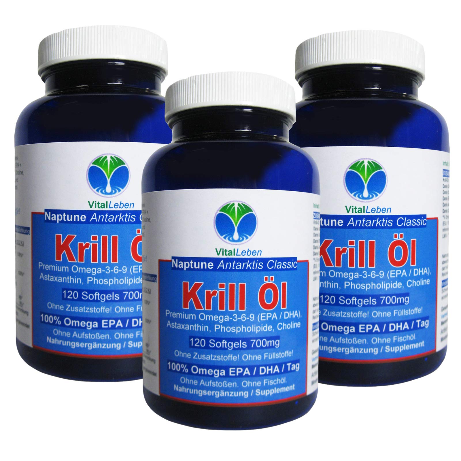 Naptune Premium Classic Krillöl from the Antarctic Premium krill oil is rich in vitamin -like substances that every person has to absorb in sufficient quantities every day because the body cannot produce these substances themselves.These include omega-3 phospholipids, omega-3-6-9 fatty acids, vitamin E, choline and the super-antiooxidan astaxanthin.They are all in optimal bioavailability for the organism in Naptune Classic Krillöl. Fair Trade: With Naptune Classic Krillöl you choose Premium quality from Antarctic.Cold processed, no additives!Naptune Classic Krill oil has no fishing aftertaste. Vegetarian/vegan capsules?Since vegetable cellulose is not completely in the stomach but often only too late in the rectum, which is undesirable for most fabrics, we have not yet decided to switch to vegan capsule shells made of hemicellulose.Our capsules are made of GMO -free fish gelatin - without genetic engineering. Ingredients / ingredients Krill oil Warnings Dietary supplements are not a substitute for a balanced and varied diet.The recommended daily dose should not be exceeded. More consumption recommendation: adults 2 capsules, children / adolescents 1 capsule, pregnancy up to 3 capsules daily before a meal with plenty of liquid.Not with crustacean allergy.Fair Trade: With Naptune Classic Krillöl you choose Premium quality from Antarctic.Also for children / adolescents and during pregnancy & breastfeeding.Pure Naptune Premium krill oil does not need bile acid for digestion and has no fishing aftertaste.This krill oil is not dosed and can be used in the long term.Pure nature - without additives,Cold processed.No fillers.Without fish oil.Not chemically standardized, not from extract.Lactose -free, gluten -free.Premium Classic from the Antarctic.Marine omega-3-6-9 fatty acids EPA + DHA (eicosapentaen acid + docosahexaenoic acid), omega-3-phospholipides, choline and astaxanthin in natural bioavailability. Naptune Premium Classic Krillöl aus der Antarktis Premium Krillöl ist reich an vitaminähnlichen Substanzen, die jeder Mensch täglich in ausreichender Menge aufnehmen muss, weil der Körper diese Stoffe nicht selber herstellen kann. Dazu gehören Omega-3-Phospholipide, Omega-3-6-9-Fettsäuren, Vitamin E, Choline und das Super-Antioxidans Astaxanthin. Sie alle stecken in optimaler Bioverfügbarkeit für den Organismus in Naptune Classic Krillöl. FAIR TRADE: Mit Naptune Classic Krillöl entscheiden Sie sich für Premium Qualität aus der Antarktis. Kalt verarbeitet, keine Zusatzstoffe! Naptune Classic Krill-Öl hat keinen fischigen Nachgeschmack. Vegetarisch/Vegane Kapseln? Da sich pflanzliche Zellulose nicht vollständig im Magen sondern oft erst zu spät im Enddarm auflöst, was bei den meisten Stoffen ungewünscht ist, haben wir uns bislang noch nicht zur Umstellung auf vegane Kapselhüllen aus Hemicellulose entschieden. Unsere Kapseln sind aus GMO-freier Fischgelatine - OHNE GENTECHNIK. INHALTSSTOFFE / ZUTATEN Krillöl WARNHINWEISE Nahrungsergänzungsmittel sind kein Ersatz für eine ausgewogene und abwechslungsreiche Ernährung. Die angegebene, empfohlene tägliche Verzehrmenge darf nicht überschritten werden. MehrVerzehrempfehlung: Erwachsene 2 Kapseln, Kinder / Jugendliche 1 Kapsel, Schwangerschaft bis 3 Kapseln täglich vor einer Mahlzeit mit reichlich Flüssigkeit einnehmen. Nicht bei Krebstierallergie. FAIR TRADE: Mit Naptune Classic Krillöl entscheiden Sie sich für Premium Qualität aus der Antarktis. Auch für Kinder / Jugendliche und in der Schwangerschaft & Stillzeit. Reines Naptune Premium Krill-Öl benötigt keine Gallensäure zur Verdauung und hat keinen fischigen Nachgeschmack. Dieses Krillöl ist nicht hochdosiert und kann langfristig angewendet werden. Natur PUR - OHNE ZUSATZSTOFFE,Kalt verarbeitet. Keine Füllstoffe. OHNE Fischöl. Nicht chemisch standardisiert, nicht aus Extrakt. Lactosefrei, glutenfrei. Premium Classic aus der Antarktis. Marine Omega-3-6-9 Fettsäuren EPA + DHA (Eicosapentaensäure + Docosahexaensäure), Omega-3-Phospholipide, Choline und Astaxanthin in natürlicher Bioverfügbarkeit.Krillöl Kapseln OMEGA 3-6-9 ANTARKTIS 360 (3x120) Softgels EPA + DHA + Astaxanthin + Antioxidantien & Vitamin E - Naptune Classic - OHNE Fischöl - OHNE ZUSATZSTOFFE. 26426-3 120 stück (3er Pack)