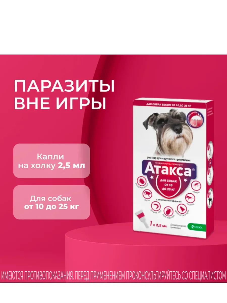 Атакса от KRKA – это эффективное средство защиты собак весом от 10 до 25 кг от паразитов. Одна пипетка этого препарата обеспечивает надежную защиту от клещей и блох, гарантируя комфорт и безопасность вашего питомца. Атакса обладает быстрым действием и длительной защитой, сохраняя вашего четвероногого друга от неприятных укусов и возможных заболеваний, которые могут быть переносчиками паразитов. Простота применения – одна из главных особенностей Атаксы: достаточно нанести содержимое пипетки на кожу в области холки, и защита будет обеспечена на протяжении всего срока действия. Выбирая Атаксу, вы выбираете надежную защиту для своего любимца от надоедливых паразитов.