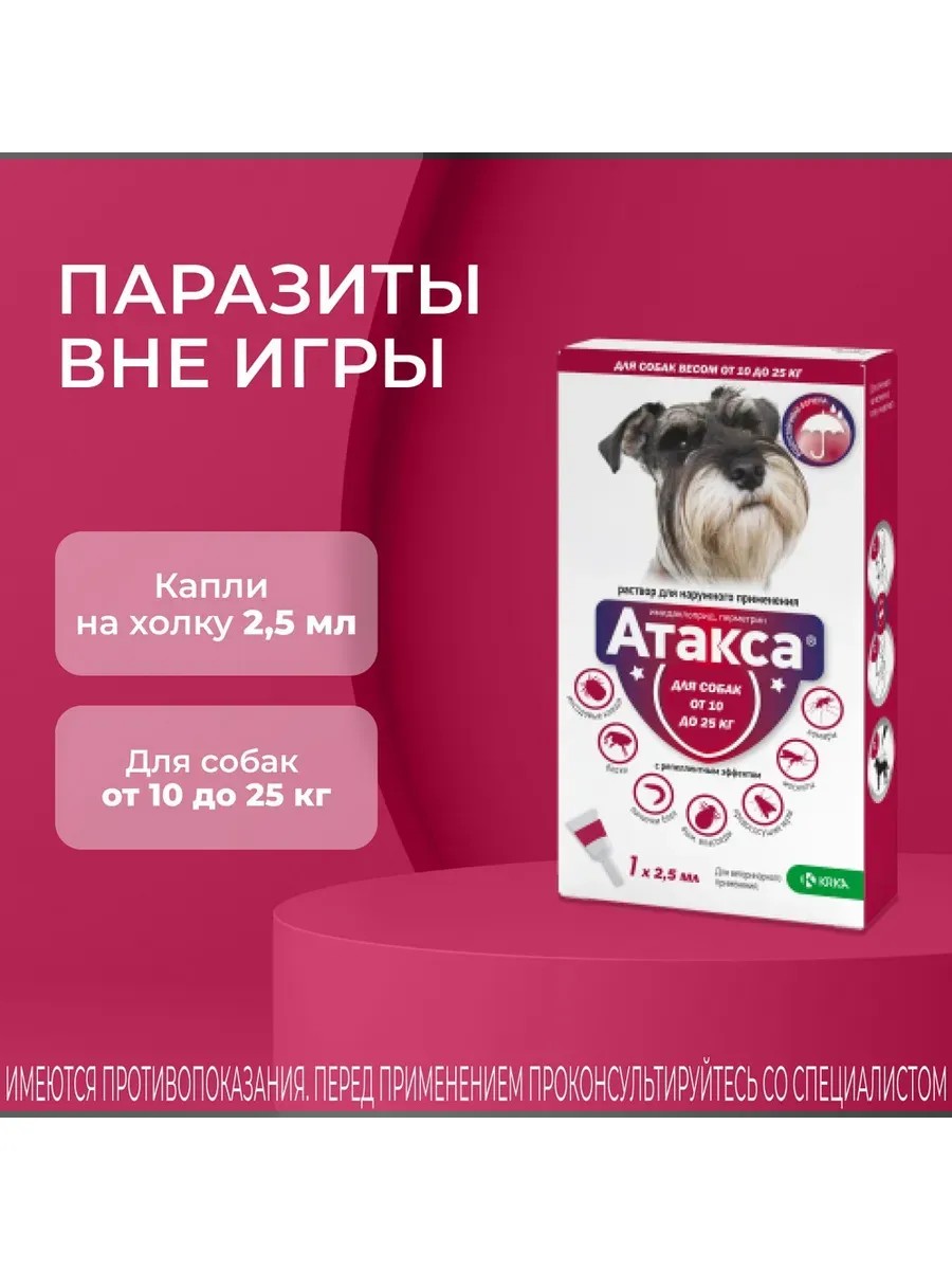 Капли на холку для уничтожения иксодовых клещей, блох, вшей, власоедов, паразитирующих на собаках, а также для отпугивания комаров и кровососущих мух. Имидаклоприд и перметрин, входящие в состав Атаксы, обладая синергидным эффектом, оказывают выраженное длительное инсектицидное, акарицидное и репеллентное действие до 4 недель.