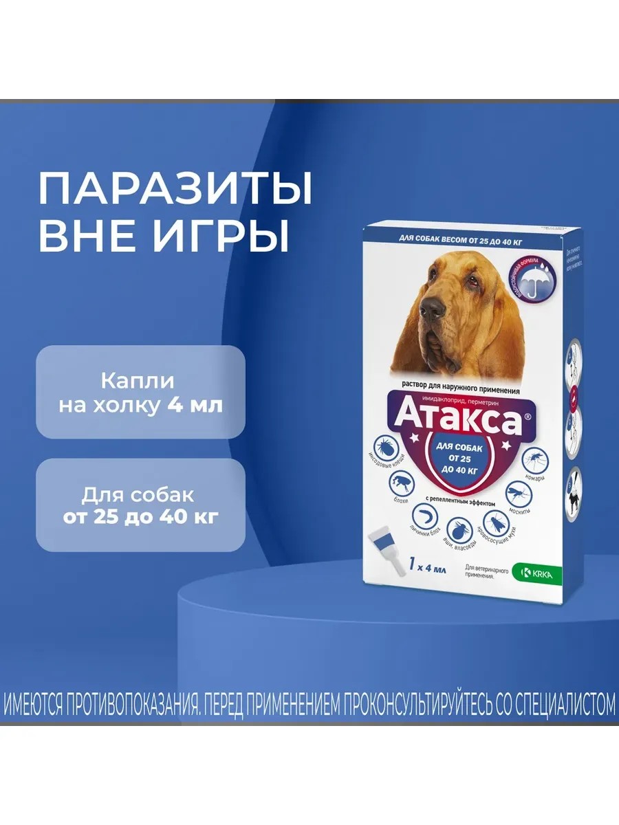 Капли на холку для уничтожения иксодовых клещей, блох, вшей, власоедов, паразитирующих на собаках, а также для отпугивания комаров и кровососущих мух. Имидаклоприд и перметрин, входящие в состав Атаксы, обладая синергидным эффектом, оказывают выраженное длительное инсектицидное, акарицидное и репеллентное действие до 4 недель.