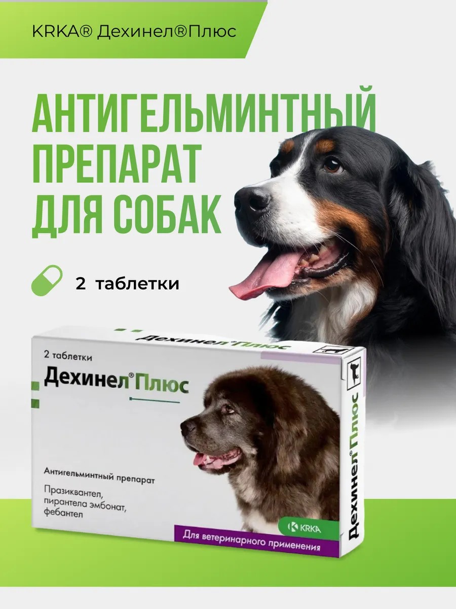 Anthelmintic drug for dogs Dehinel Plus (international nonproprietary name: febantel + pyrantel embonate + praziquantel) contains as active ingredients in one tablet: 150 mg of febantel, 144 mg of pyrantel embonate and 50 mg of praziquantel, and as auxiliary components - lactose monohydrate, corn starch, povidone K30, sodium lauryl sulfate, microcrystalline cellulose, colloidal silicon anhydride, magnesium stearate and a flavoring additive with meat flavor.
