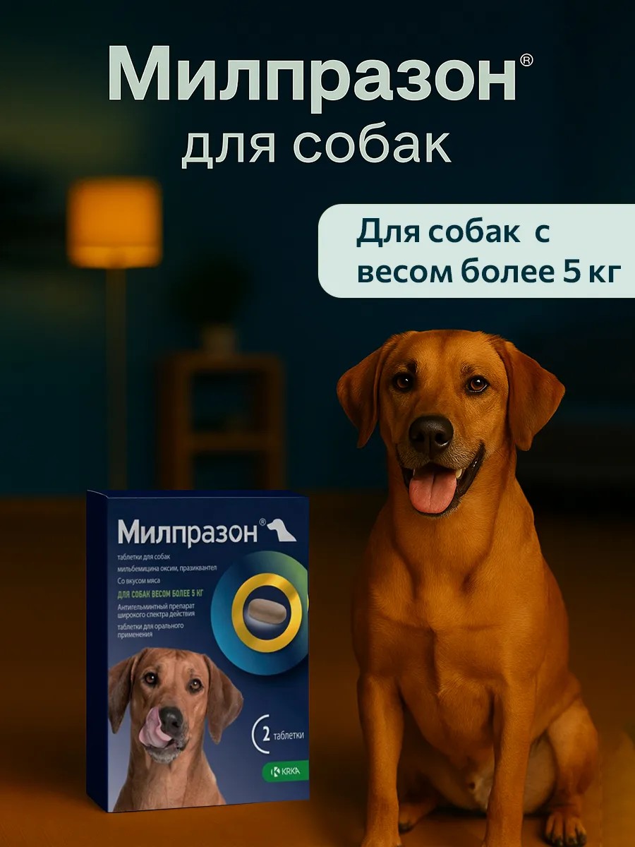 Milprazon is a deworming medication for dogs weighing 5 to 25 kg. It kills nematodes, cestodes, and their larvae, and is used to treat and prevent helminthic infestations. The tablet has a meaty flavor and is easy to swallow with food. European quality from KRKA.
