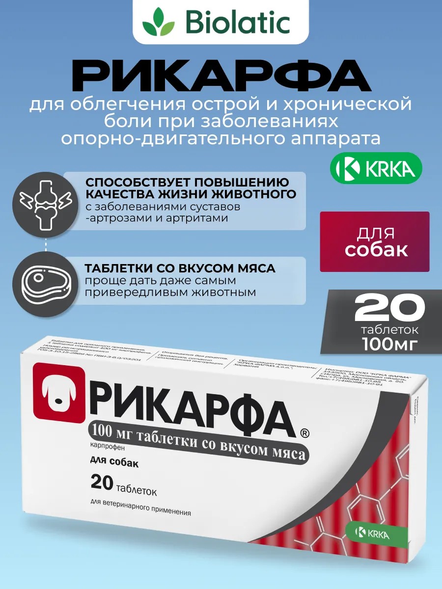Рикарфа таблетки со вкусом мяса является нестероидным противовоспалительным и обезболивающим лекарственным средством для собак (международное непатентованное наименование: карпрофен). Препарат в качестве действующего вещества в одной таблетке содержит 20 мг карпрофена и вспомогательные компоненты: моногидрат лактозы, кукурузный крахмал, оксид железа красный, оксид железа черный, поливидон К30, крахмала гликолят натрия, коллоидный ангидрид кремния, тальк, стеарат магния и ароматизатор запаха и вкуса мяса 10022.