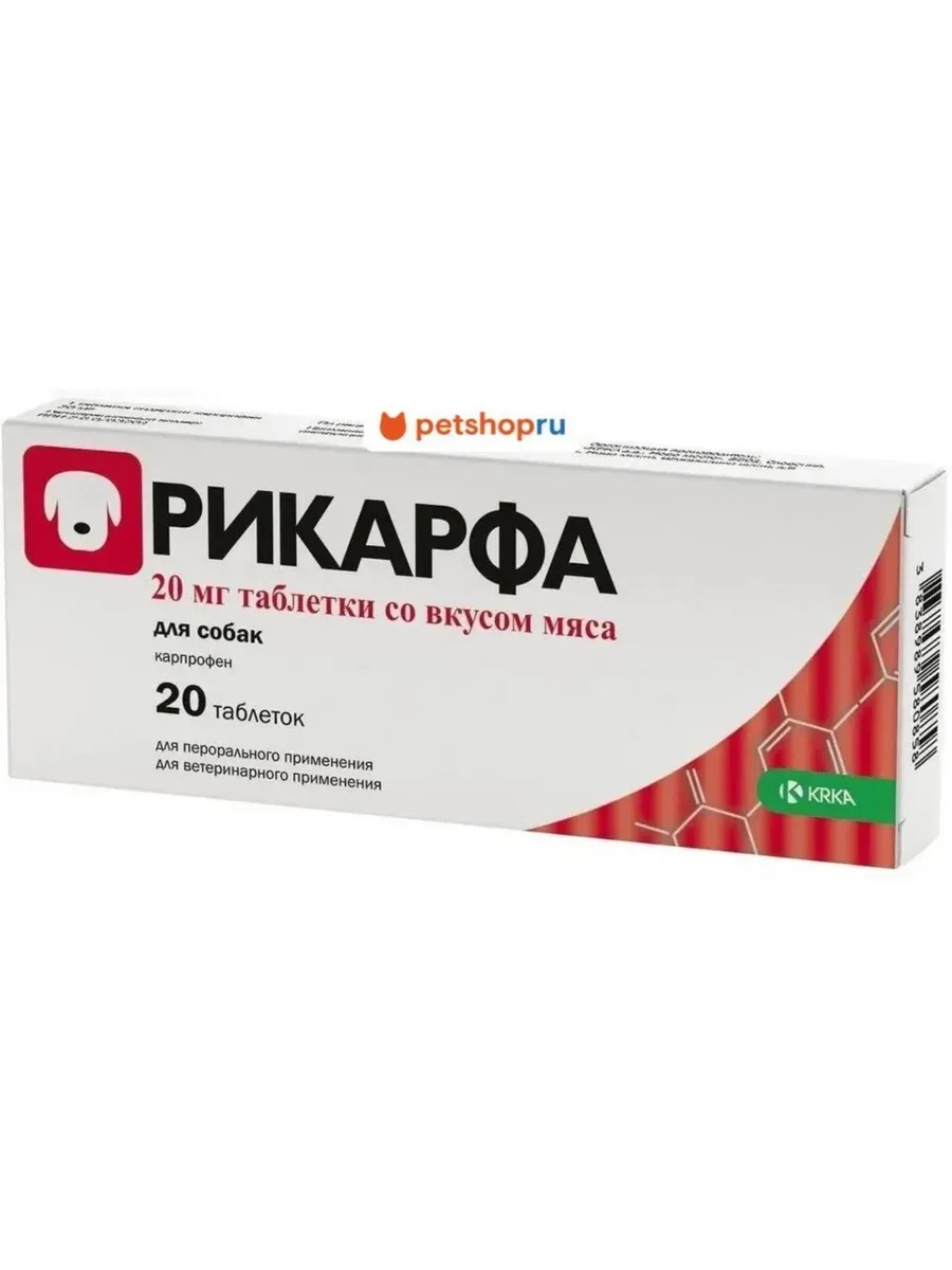 Рикарфа таблетки со вкусом мяса применяют собакам при воспалительных и болевых синдромах, возникающих при острых и хронических заболеваниях опорно-двигательного аппарата, а также в качестве анальгезирующего и противовоспалительного средства в послеоперационный период.
