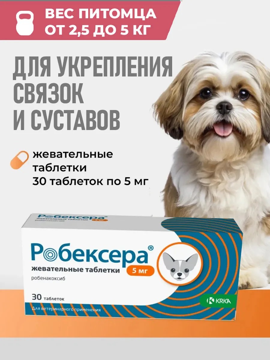 ROBEXERA 40mg, meat-flavored chewable tablets for dogs weighing 20-40kg, 30 tablets. A non-steroidal anti-inflammatory drug for the relief of pain and inflammation in acute and chronic diseases of the musculoskeletal system, as well as for postoperative pain relief. ACTIVE INGREDIENT: robenacoxib. Robenacoxib is a non-steroidal anti-inflammatory drug of the coxib group, a selective, specific COX-2 inhibitor with anti-inflammatory and analgesic effects. INDICATIONS: Robexera is used in dogs as an anti-inflammatory and analgesic drug for inflammatory and pain syndromes of various origins, including acute and chronic diseases of the musculoskeletal system (arthritis, arthrosis, synovitis, dislocations), inflammatory diseases of soft tissues, and also as an analgesic and anti-inflammatory drug in the postoperative period. DOSAGE AND ADMINISTRATION: Robexera chewable tablets are administered to dogs individually once daily in the following doses: 2.5 to 5 kg - 5 mg; 5 to 10 kg - 10 mg; 10 to 20 kg - 20 mg; 20 to 40 kg - 40 mg; 40 to 80 kg - 80 mg. It is recommended to administer the drug separately from feeding, but, if necessary, the drug can be given with food. Tablets should not be crushed or broken. When treating diseases of the musculoskeletal system, the course of treatment is determined by the attending veterinarian. For the treatment of osteoarthritis, tablets can be prescribed to the animal for life. During surgical interventions, Robexera chewable tablets are administered 30 minutes before induction of anesthesia at a dose of 1-2 mg per 1 kg of animal weight; in the postoperative period, treatment can be continued for a period of up to 14 days. CONTRAINDICATIONS: When Robexera is used according to the instructions, side effects and complications in animals are generally not observed. Gastrointestinal disturbances (vomiting, soft stools, or diarrhea) are possible; these symptoms resolve spontaneously and do not require the use of medication. If an animal shows hypersensitivity to the drug or develops allergic reactions, discontinue use and prescribe antihistamines and symptomatic medications. Do not use Robexera chewable tablets in animals that are dehydrated, hypovolemic, or hypotensive, or have gastrointestinal ulcers, or in animals weighing less than 2.5 kg, pregnant or lactating animals, or puppies under 3 months of age. For more information on contraindications, see the instructions for use.