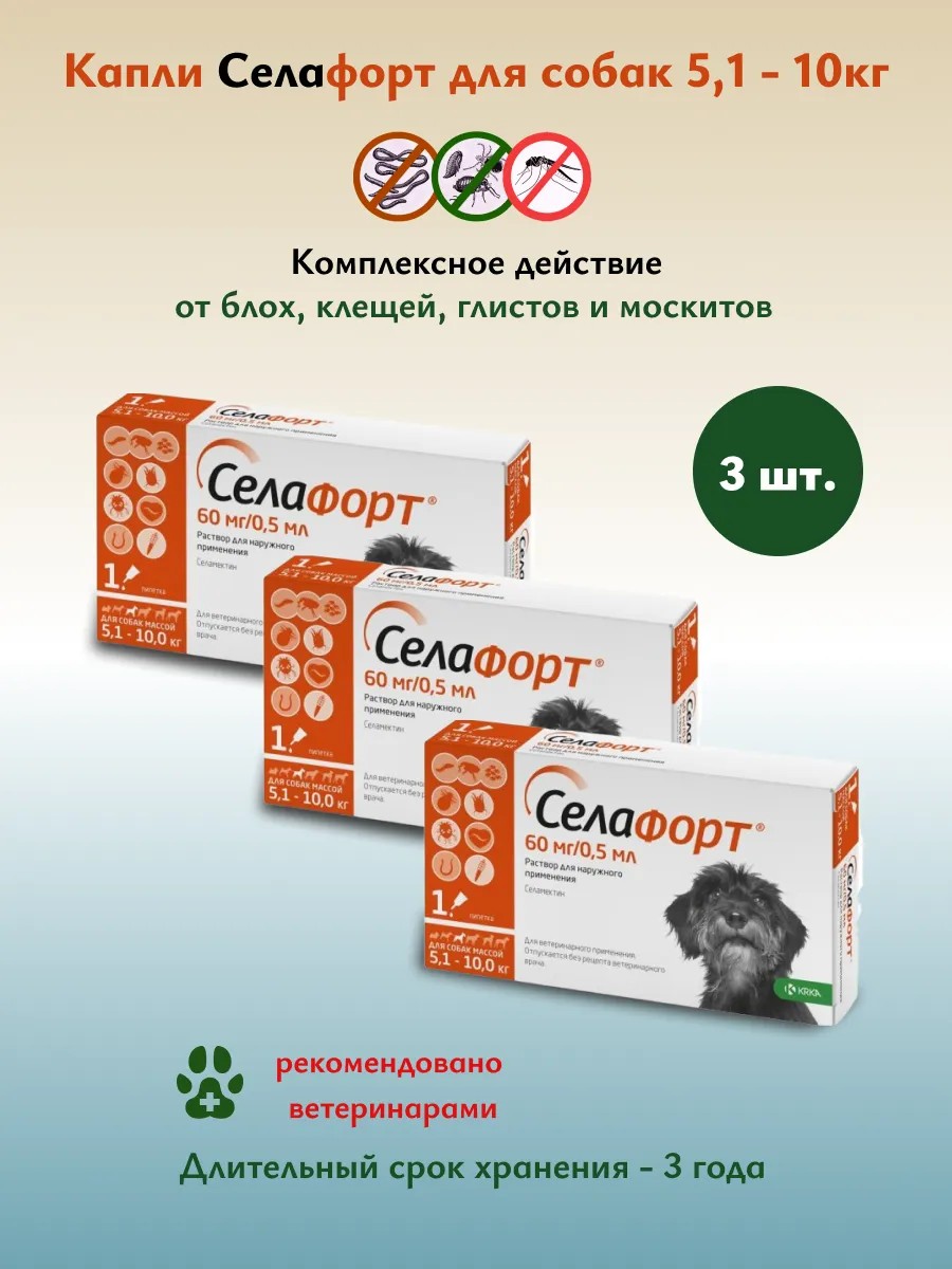 Селафорт — капли на холку для одновременной защиты вашего питомца от внешних и внутренних паразитов: блох, круглых кишечных гельминтов, ушного и чесоточного клещей, а также демодекоза. Селафорт — это оптимальный выбор для профилактики и лечения основных паразитов, вызывающих зуд! Одна пипетка для длительной защиты на протяжении месяца от блох, круглых кишечных гельминтов, ушного и чесоточного клещей, а также демодекоза. Впитывается за 30 минут и уже через 2 часа после обработки можно мыть животных с шампунем и допускать к детям! Не оставляет следов на шерсти благодаря запатентованному составу (Европейский патент IPN: WO 2018/167271 A1; IAN: PCT/EP2018/056667). Селафорт удобно применять: Прозрачная пипетка со скругленным носиком, Многоразовый колпачок позволяет при необходимости повторно закрыть пипетку и провести обработку в более удобное время. Преимущества Селафорта: Применяется для лечения блошиного дерматита, отодектоза (ушного клеща) и саркоптоза (чесотки) — паразитарных болезней, сопровождающихся зудом, расчесами и другими поражениями кожи, Хорошо переносится собаками разных пород, в том числе колли, шелти, аусси и т.д. Подходит для профилактики заражения сердечными гельминтами (дирофиляриозом), а также может применяться уже инвазированным животным. Разрешен самым маленьким щенкам с 6-недельного возраста без ограничений по весу.