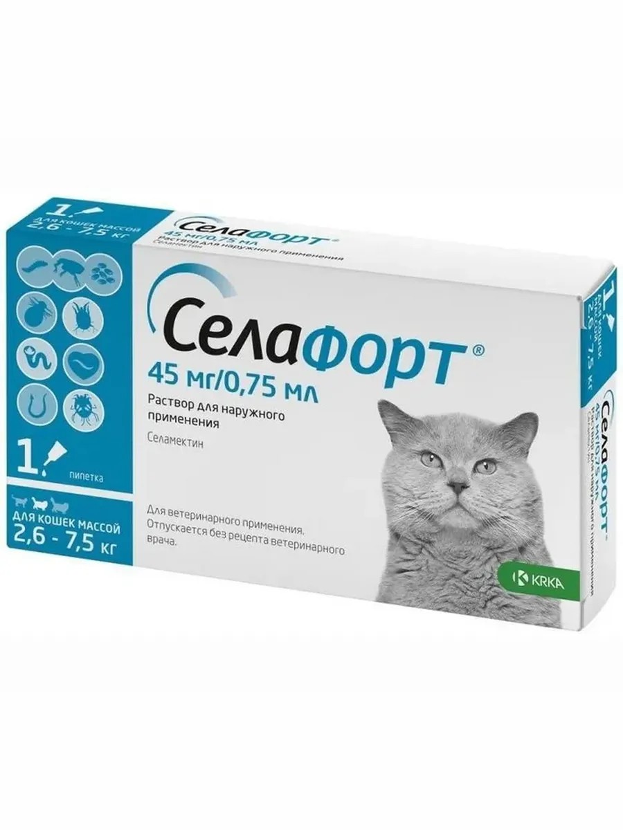 | Полное наименование товара | Селафорт 6% для кошек 2,6-7,5 кг, 0,75 мл (45 мг), капли на холку от блох и гельминтов ( 1 пипетка) |