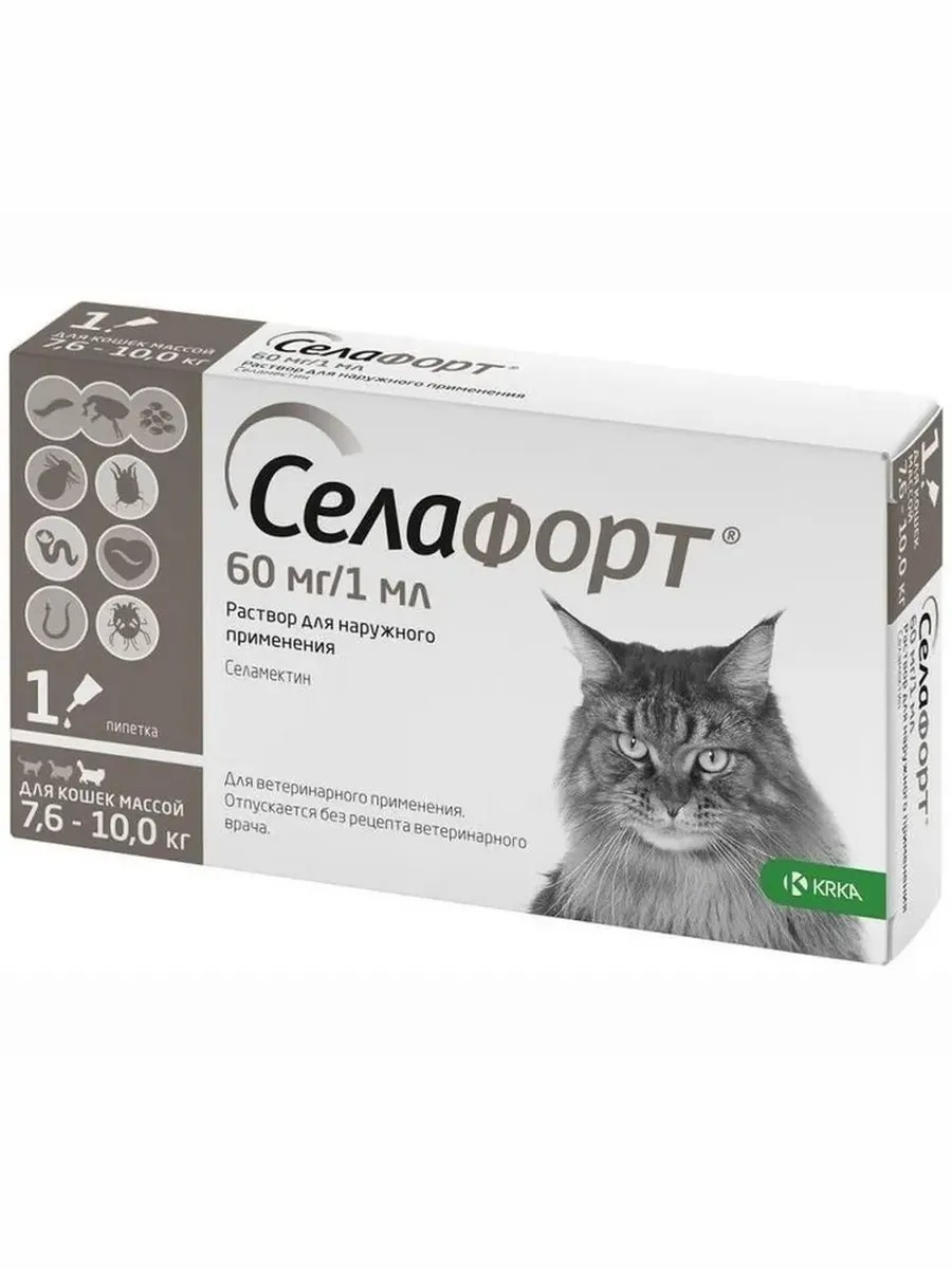 | Полное наименование товара | Селафорт 6% для кошек 7,6-10 кг, 1 мл (60 мг), капли на холку от блох и гельминтов ( 1 пипетка) |