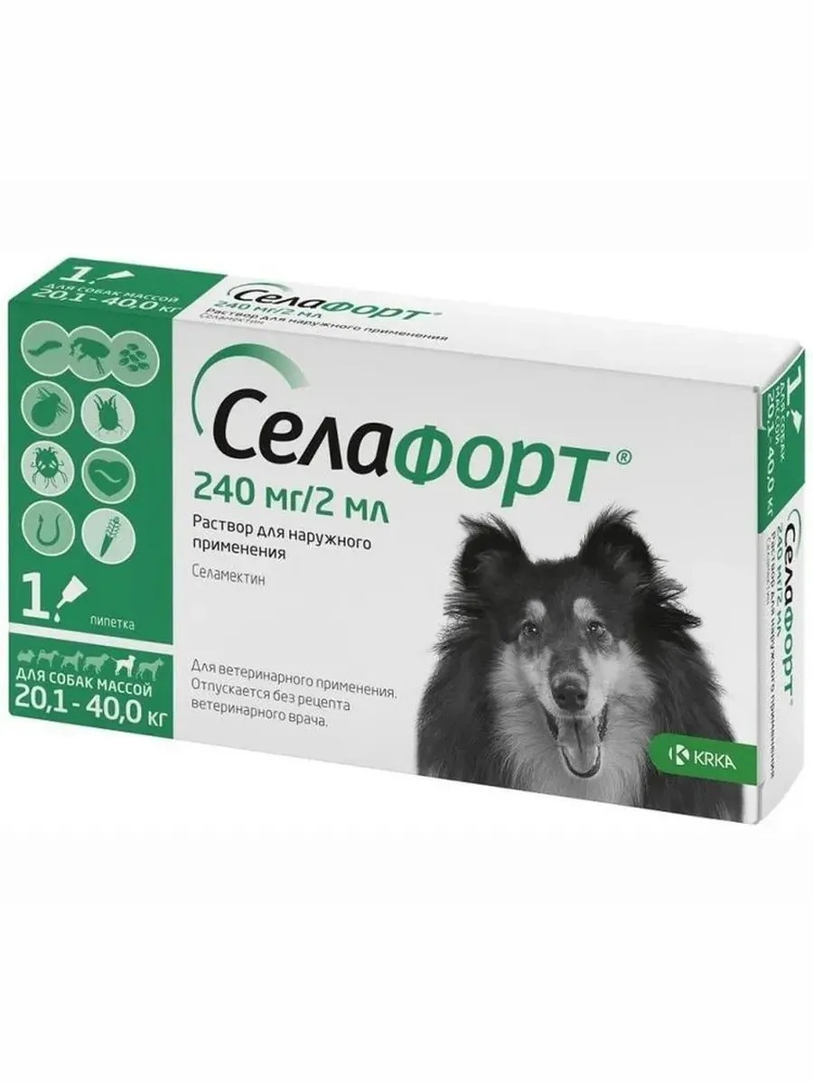 | Full name of the product | Drops on the withers from fleas and helminths Selafort 12% for dogs 20.1-40 kg, 2 ml (240 mg), (1 pipette) |