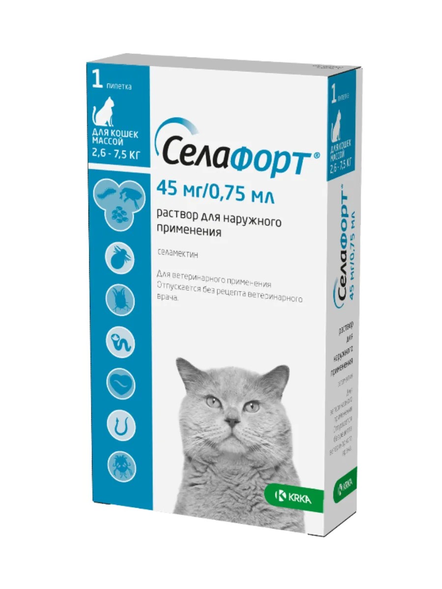 Селафорт — капли на холку для одновременной защиты от основных внешних и внутренних паразитов: блох, круглых кишечных гельминтов, ушного и чесоточного клещей.