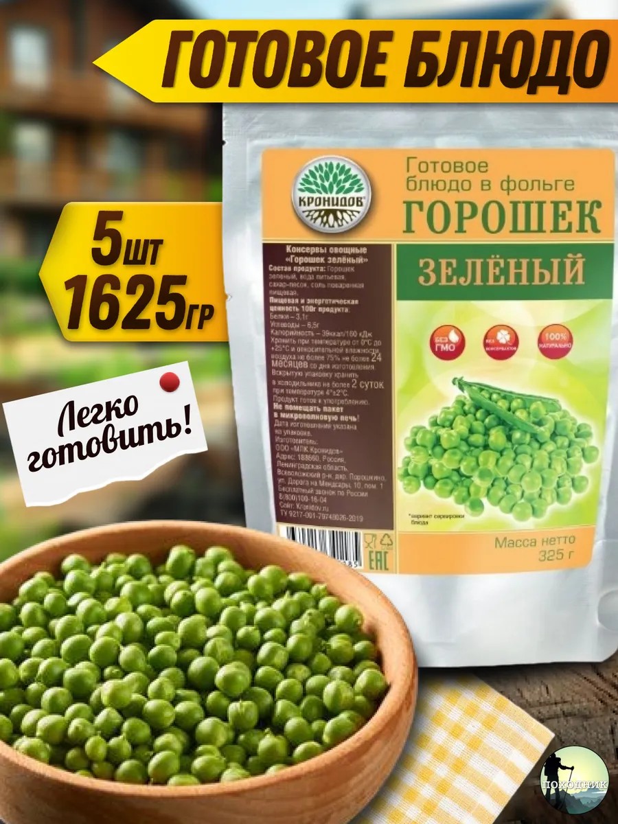 | Package Contents | green peas; ready-made peas; travel food; ready-made snack; snack in a rutort bag; rutort bag; food for hiking; tourist food; kronidov; dietary dish; 5 servings; IRP |