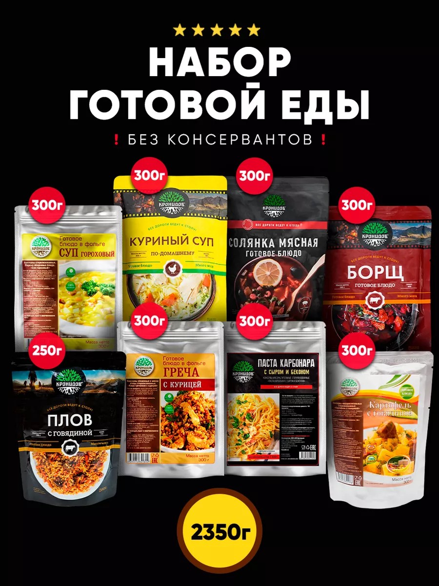 | Особенности продукта | Без гмо, натуральный продукт, без консервантов; Набор готовых блюд, кронидов, готовая еда; Готовые блюда, сух пай, сухой паек, сух паек |