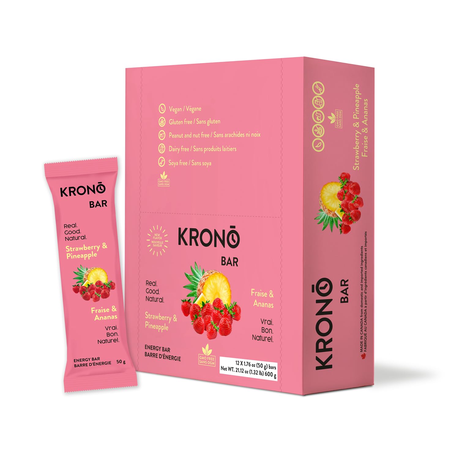 Krono Nutrition Energy Bar - Made with Natural Ingredients - Vegan - Gluten Free - Nuts Free - Soy Free - 50 gram per bars - 12 bars per box (12 count Strawberry & Pineapple) Strawberry & Pineapple 1 Count (Pack of 12)
