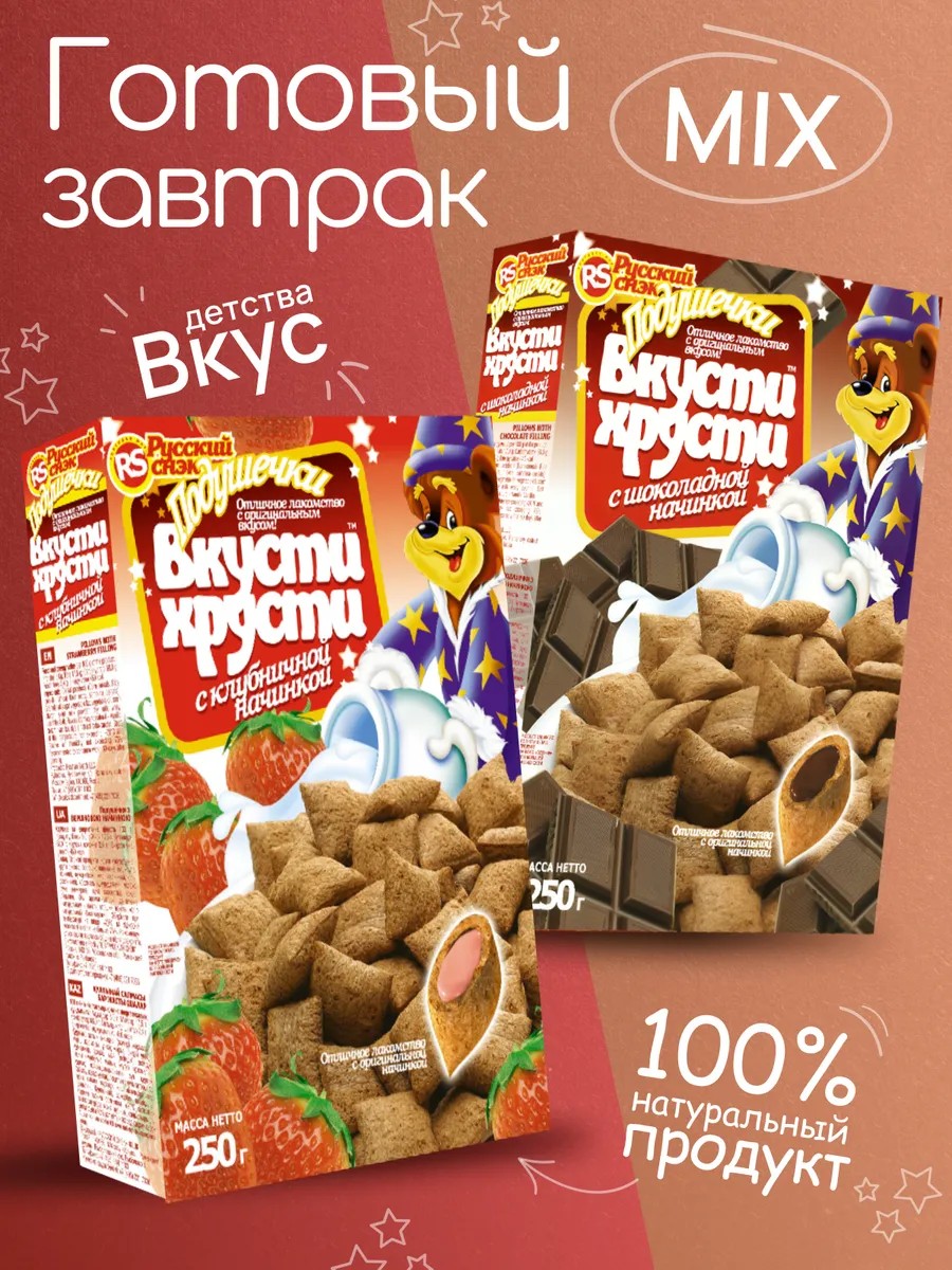 This dry breakfast is an excellent choice for parents who care about the health of their children and want to offer them something tasty and healthy. It helps form healthy eating habits and makes morning meals enjoyable and interesting. Thanks to their rich taste and attractive appearance, "Strawberry + Chocolate Pillows" will become a favorite breakfast for your little ones, bringing joy and benefit every day.