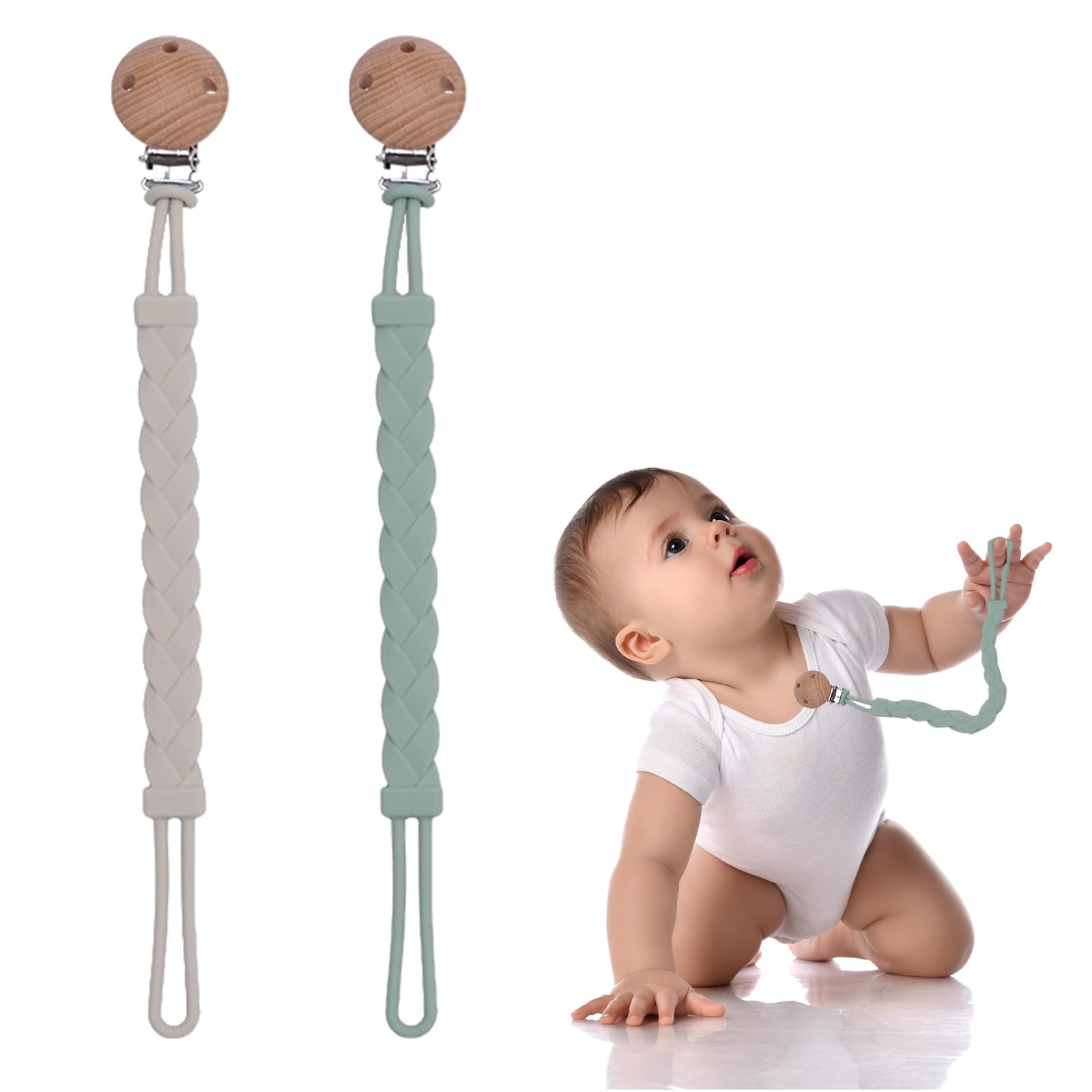 Kryzalite 2 Stück Schnullerketten-Clips, Premium-Silikon-Flechtmuster, für Babys, Mädchen und Jungen, Sturz verhindern, für Beißringe, Spielzeug und Babypartys (Hellgrau, Salbei)